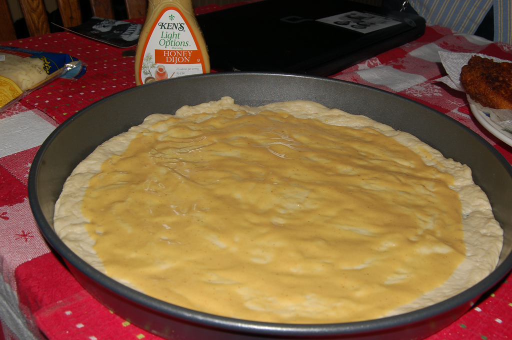 Given that I was occupied with frying five times as much chicken as we would actually need for the pizza, Meg A. was tasked with preparing the dough. Apparently the bakery it came from is unaware “dough relaxer” is an existent product, frequently used in pizza making, since the dough itself refused to mold to the pan and took nearly as long as the chicken did. A base layer of honey mustard was laid as a sticky, tangy groundwork for the pizza.