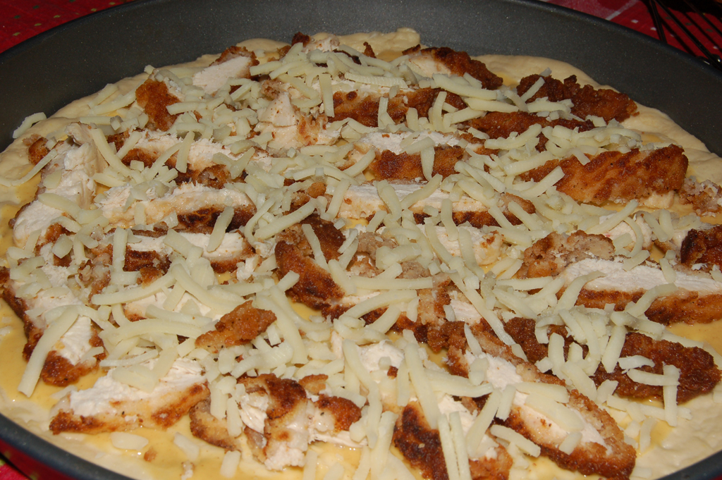 After cutting the chicken into pieces, it was laid en masse onto the newly defeated dough. Mozzarella was the cheese of choice to top it off.