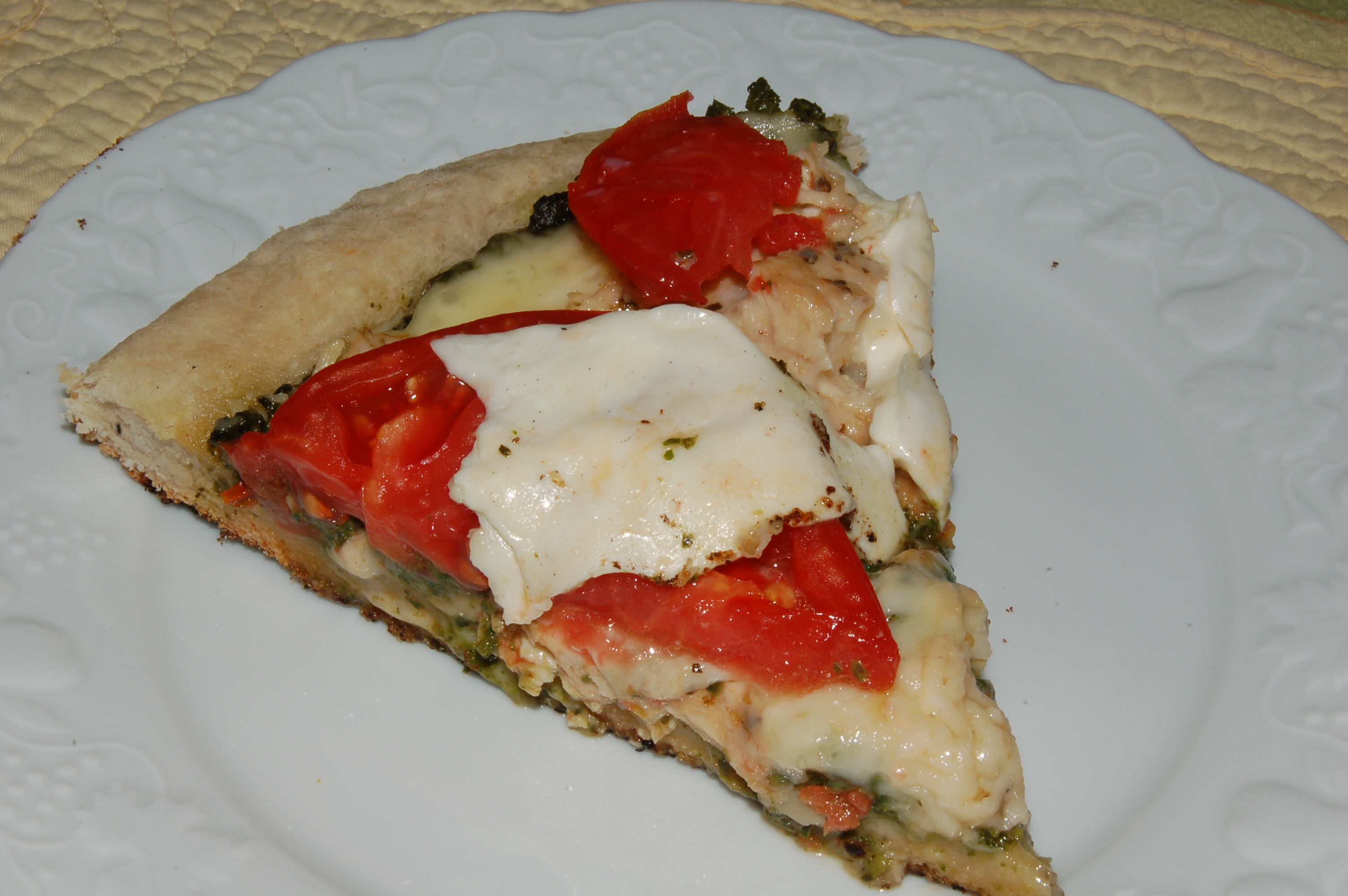 Meg A. True. It wasn’t so much, “what weird stuff can we put on this pizza” but “how much delicious stuff can we cram into this pizza.” Another note was that every ingredient was fresh. We picked up fresh cheese from the deli, bought fresh garlic, grilled fresh chicken, and sliced fresh tomatoes from our garden, and the pesto was made with fresh basil from the garden as well.