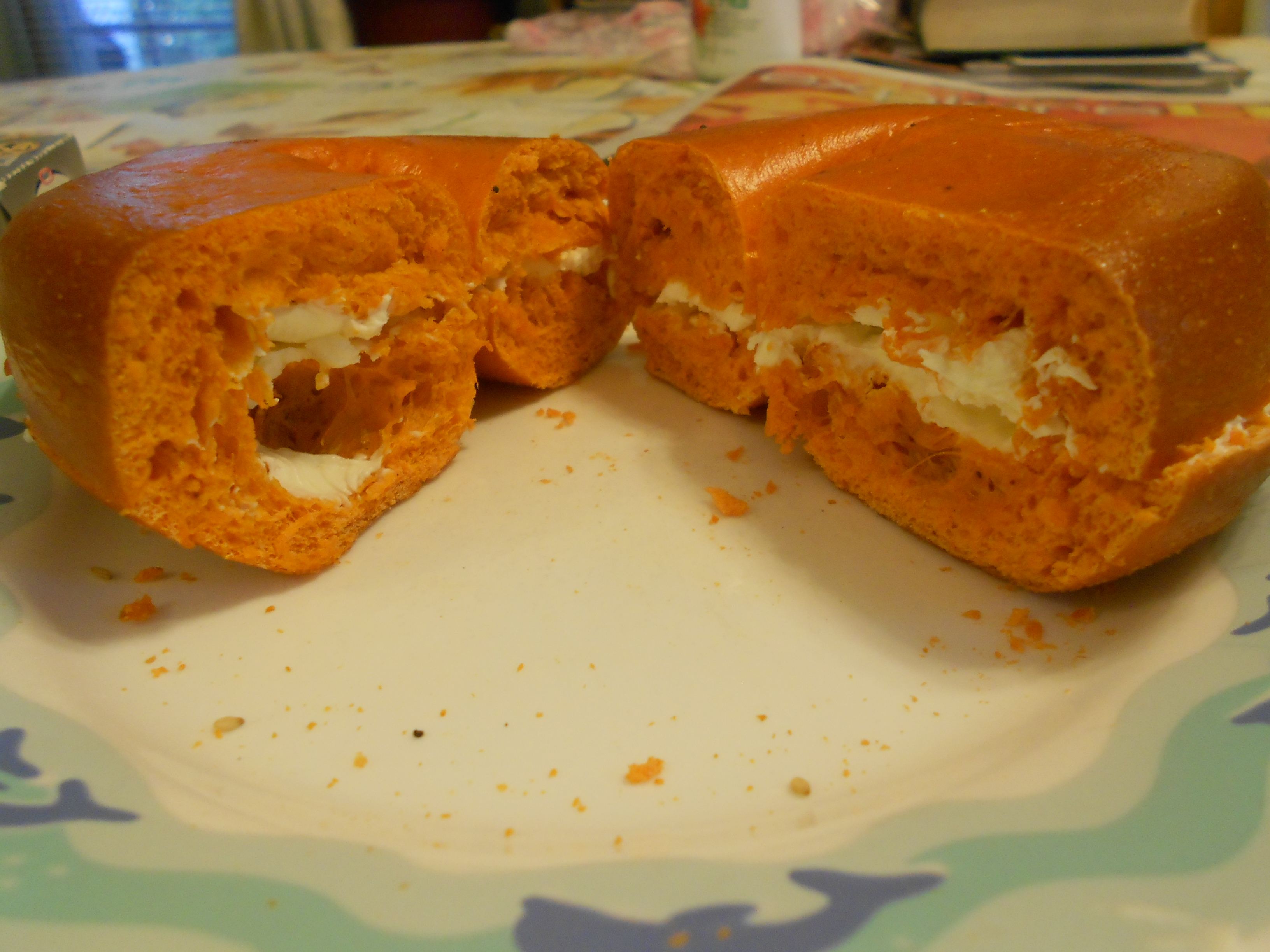 I wish I could say what bagel place this came from, but since I was not that one to bring it home, I’m really not sure. I’m sure multiple bagel places will have them though (in New York anyway. Outside of NY, you’re on your own, sorry). I actually had pumpkin bagels a couple of times this fall. The first time I just had it warmed up and with cream cheese, the second I toasted and put butter on. I thought the butter would help enhance the pumpkin flavor, but surprisingly I found it was the cream cheese that complemented it best. I wouldn’t want to eat one every day, but it was a nice fall treat.