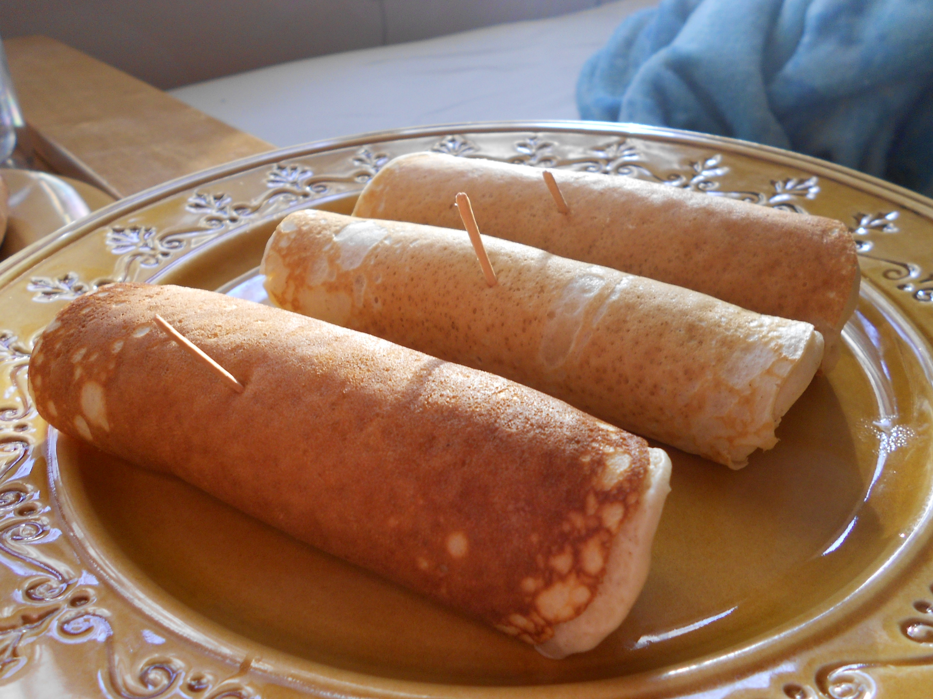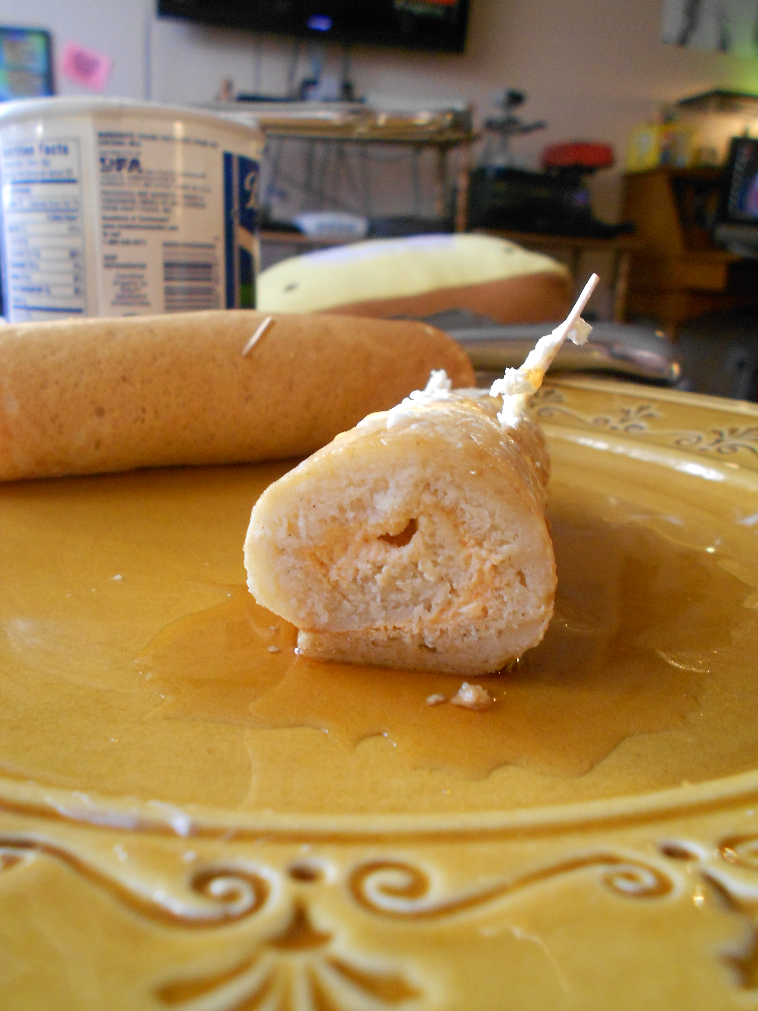 Combine the pancake mix according to the directions for that mix. Add a tablespoon or so of the pumpkin pie spice (how much really depends on how many pancakes you’re making. For pancakes for 2 people I’d say maybe 1 ½ tablespoons). Cook pancakes on griddle. Once they’re done, spread about a tablespoon of the pumpkin cheese on the warm pancake, and roll up. Stick with a toothpick through the middle to hold in place. Serve with maple syrup and/or whipped cream. Enjoy your friends’ and loved ones’ awe and amazement at your cooking skills.