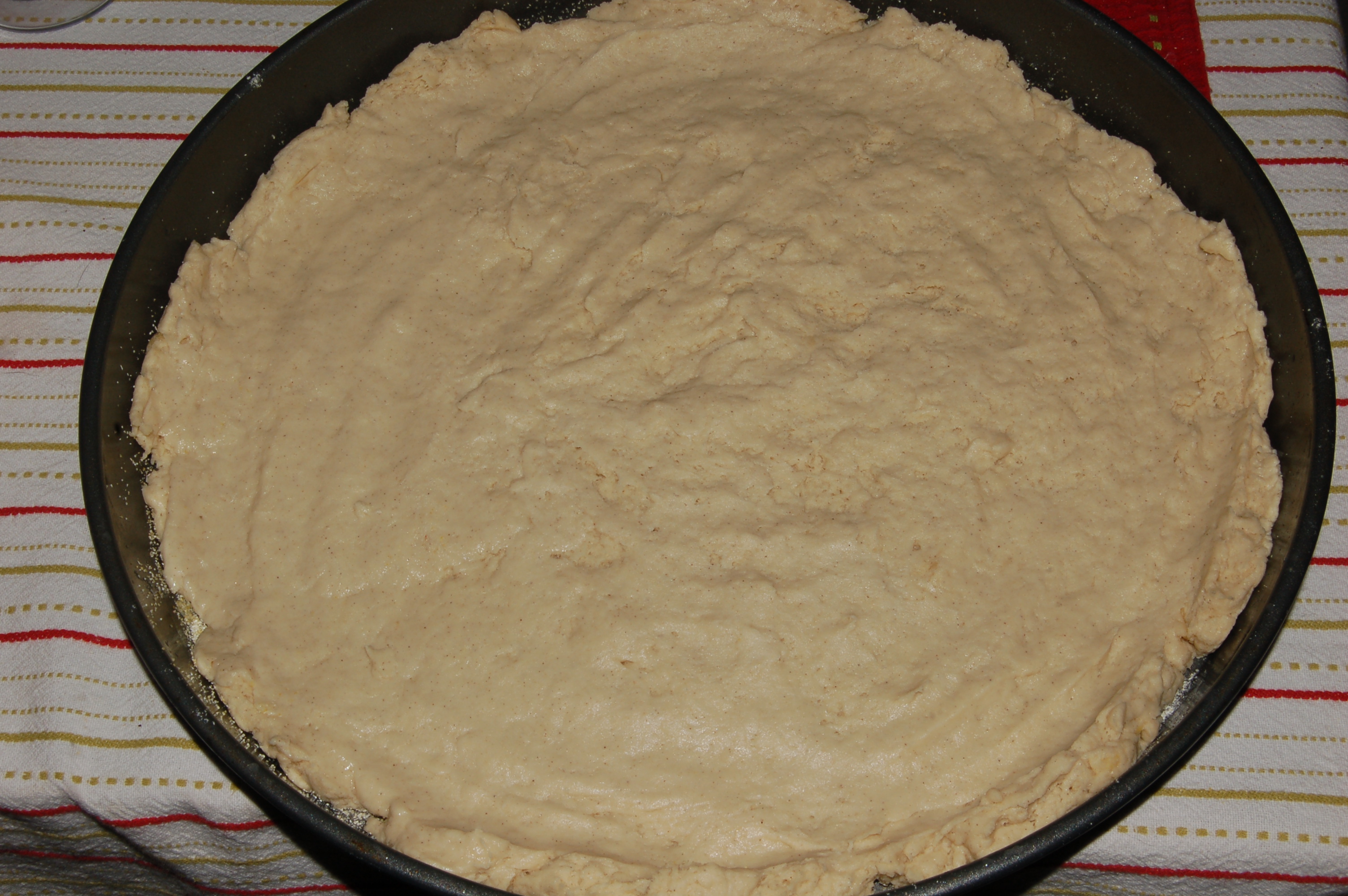 Meg A. It was interesting working with this dough because it was a lot stickier than what I’m used to. I had to keep wetting my hands to keep it from sticking. Also important to note: don’t flour the pan with regular flour, since that would, you know, negate the entire premise of it being gluten free. We usually use corn meal anyway, so that wasn’t a problem.