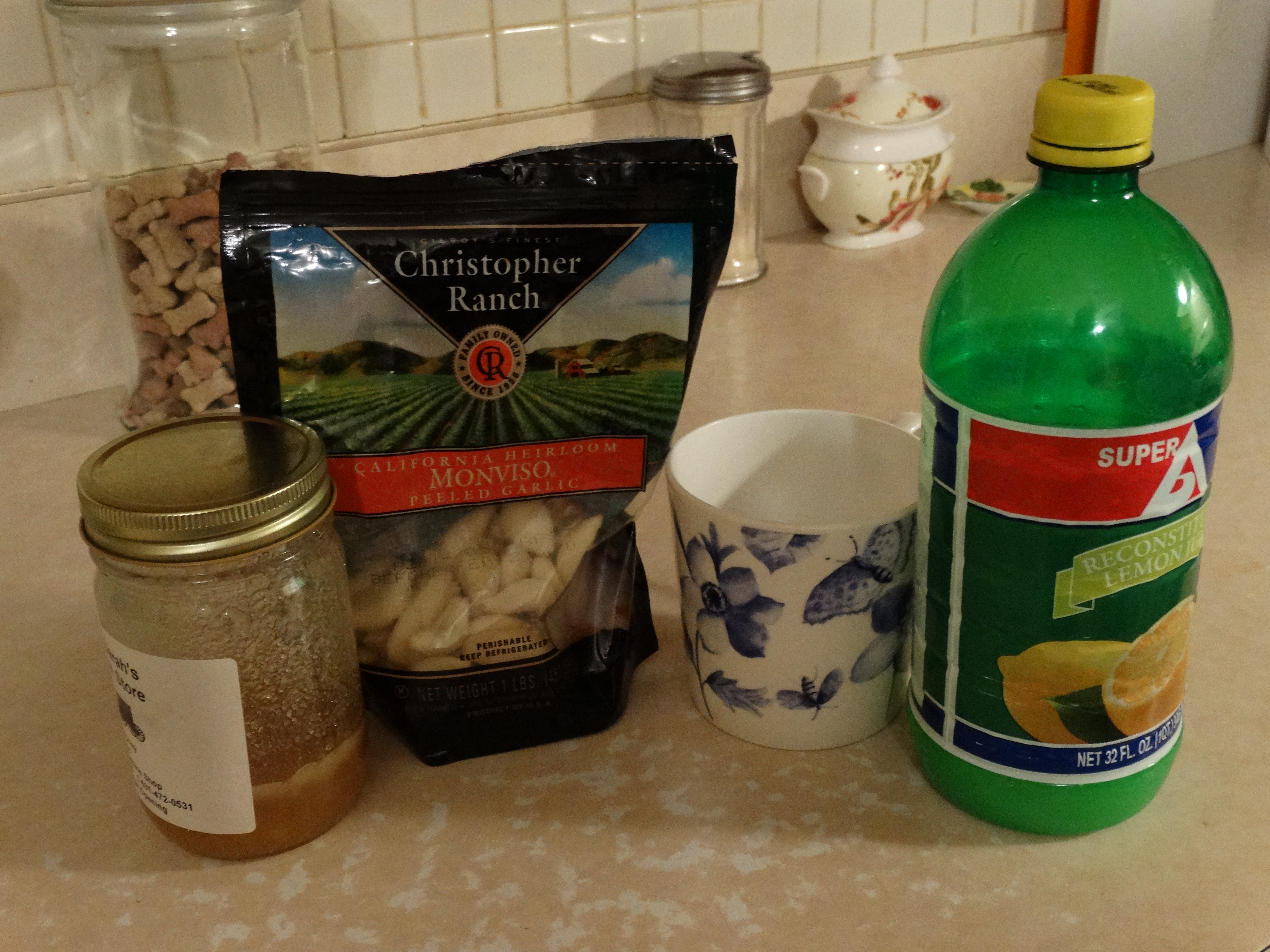 Slice 3 cloves of garlic and place in the mug, along with ¼ each of lemon juice (fresh or bottled) and honey.