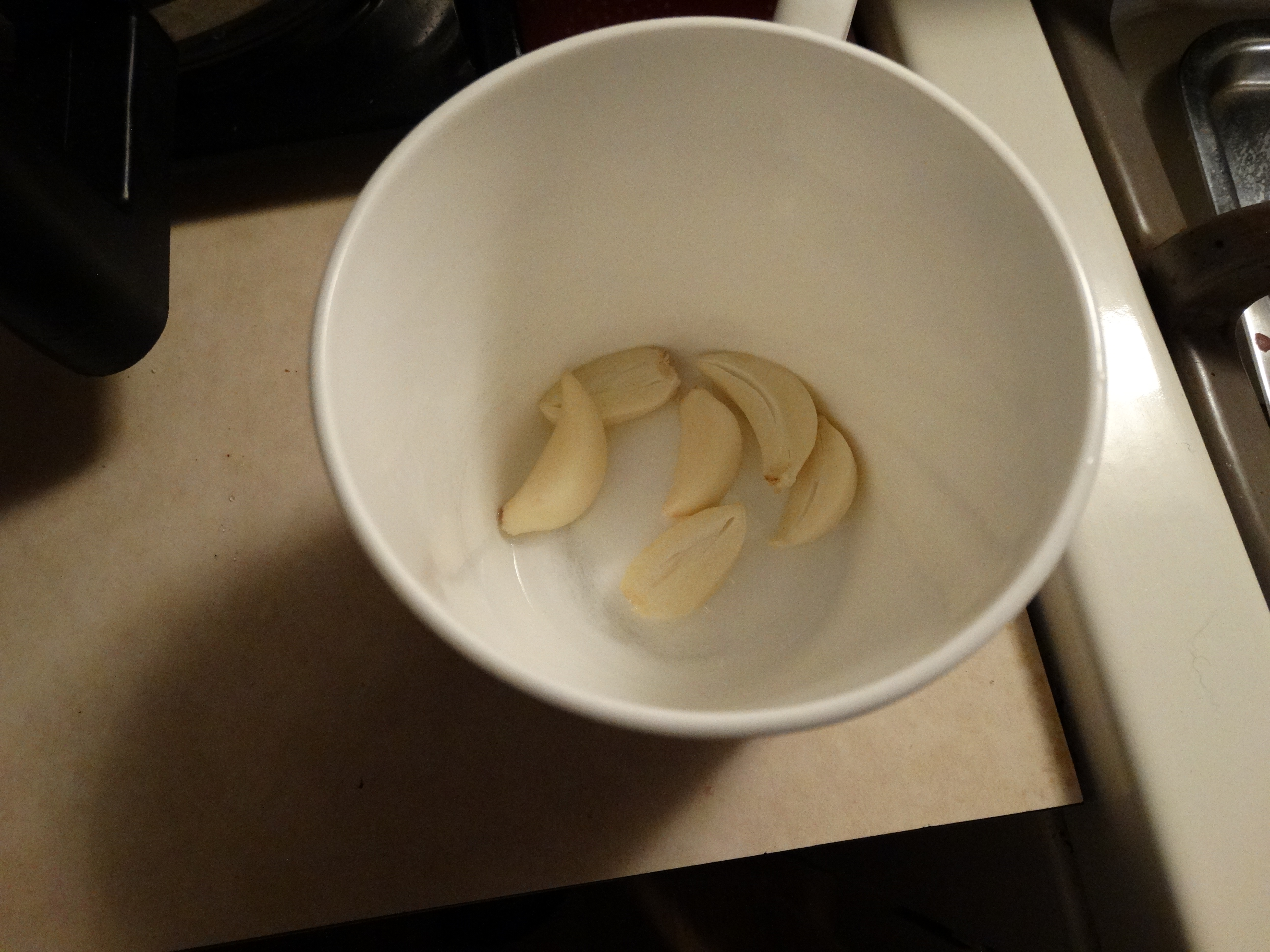 Combine ingredients in a mug and let steep for 10 minutes. Remove the garlic and enjoy.