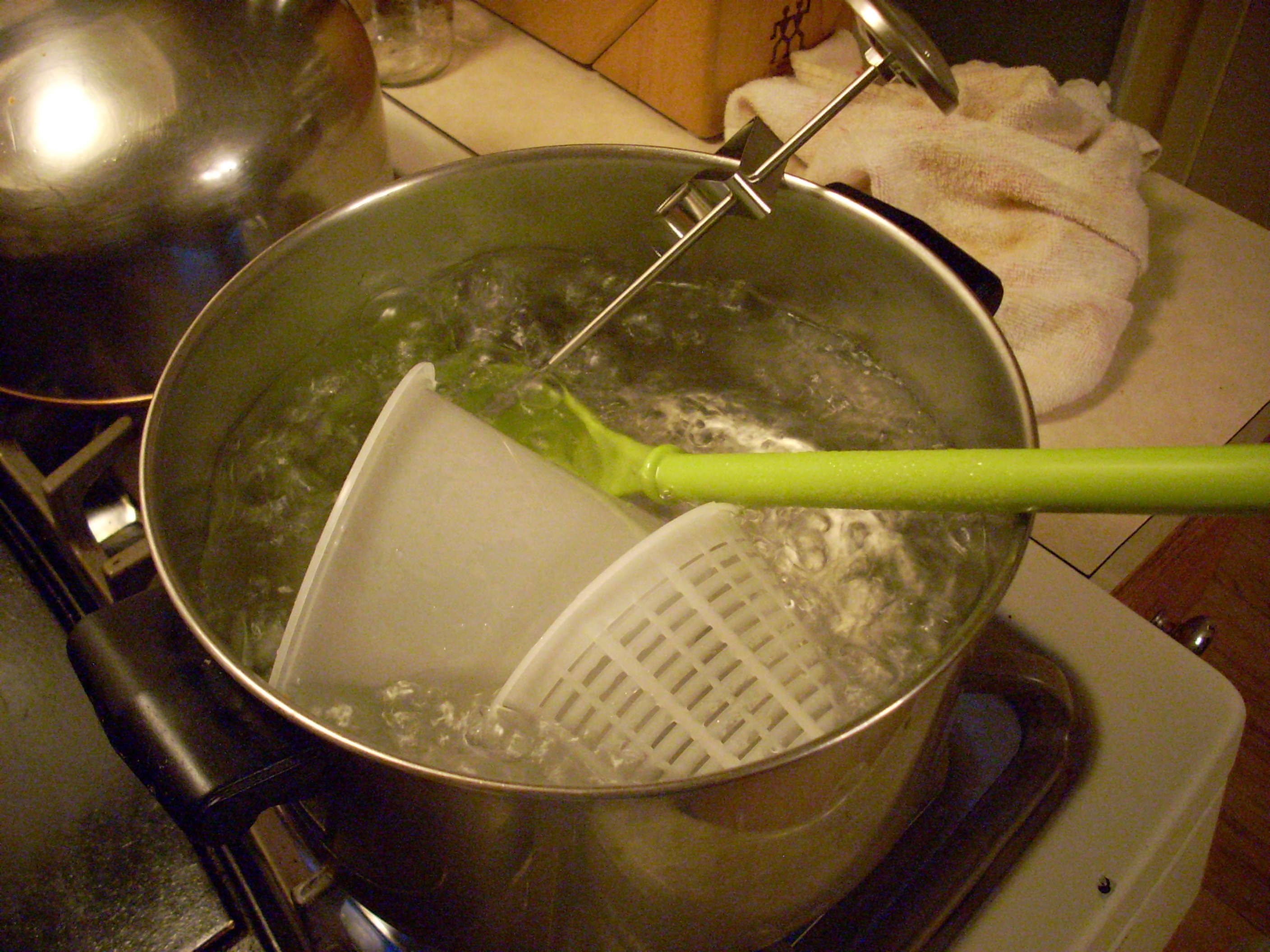 We decided our first cheese would be ricotta salata. Ricotta salata is a variant of ricotta that’s been dried, salted, and aged (salata means salted). It has a stronger flavor than basic ricotta and is good for grating or crumbling. Flavor-wise it’s a little bit like feta, but not nearly as strong. We decided it tastes somewhere between a salty mozzarella and a smooth provolone. To make the ricotta salata we first had to make basic ricotta. Making the ricotta was pretty easy. I think the hardest part was stirring the milk while it heated up, since my hand kept getting incredibly warm.
