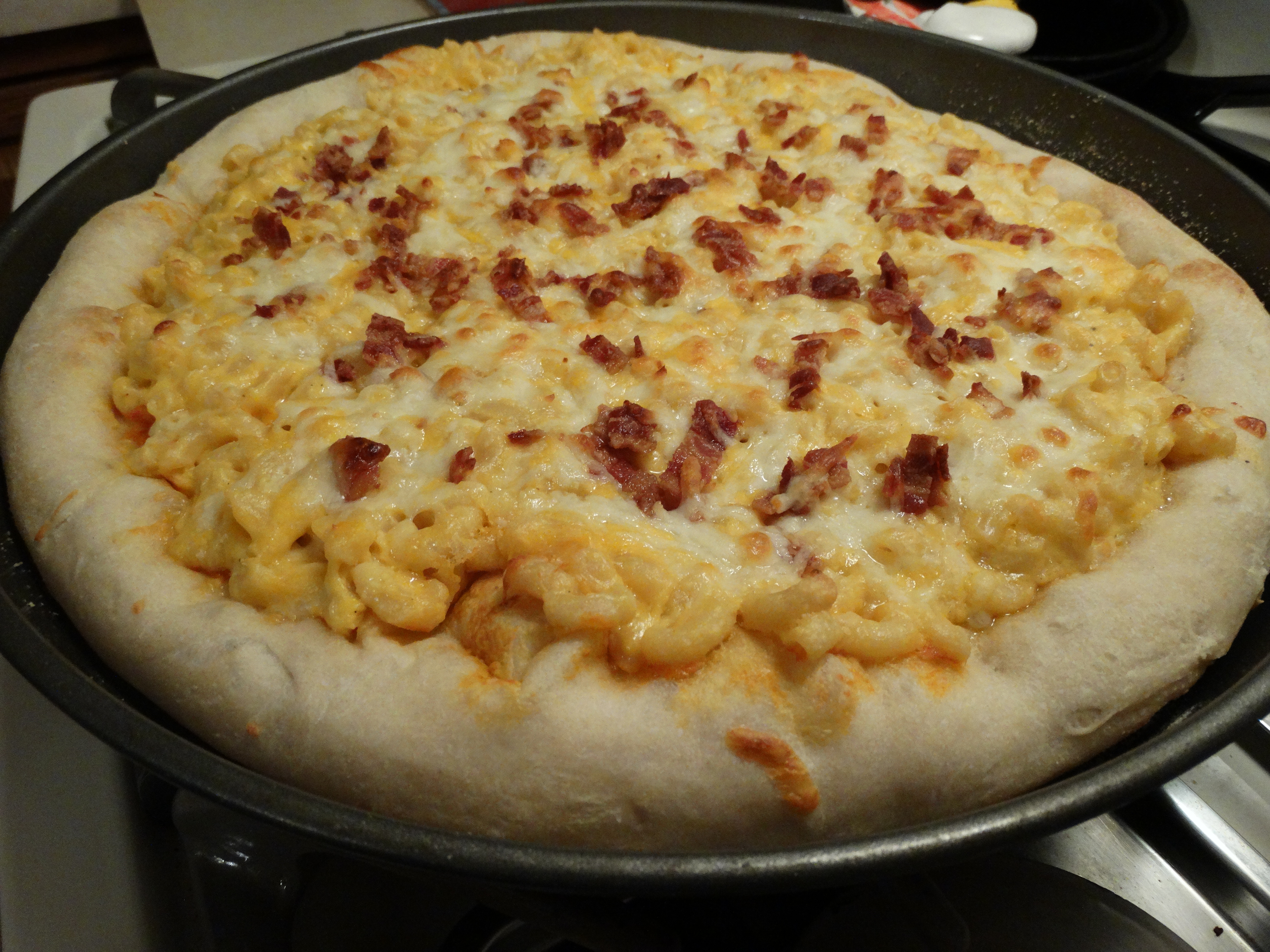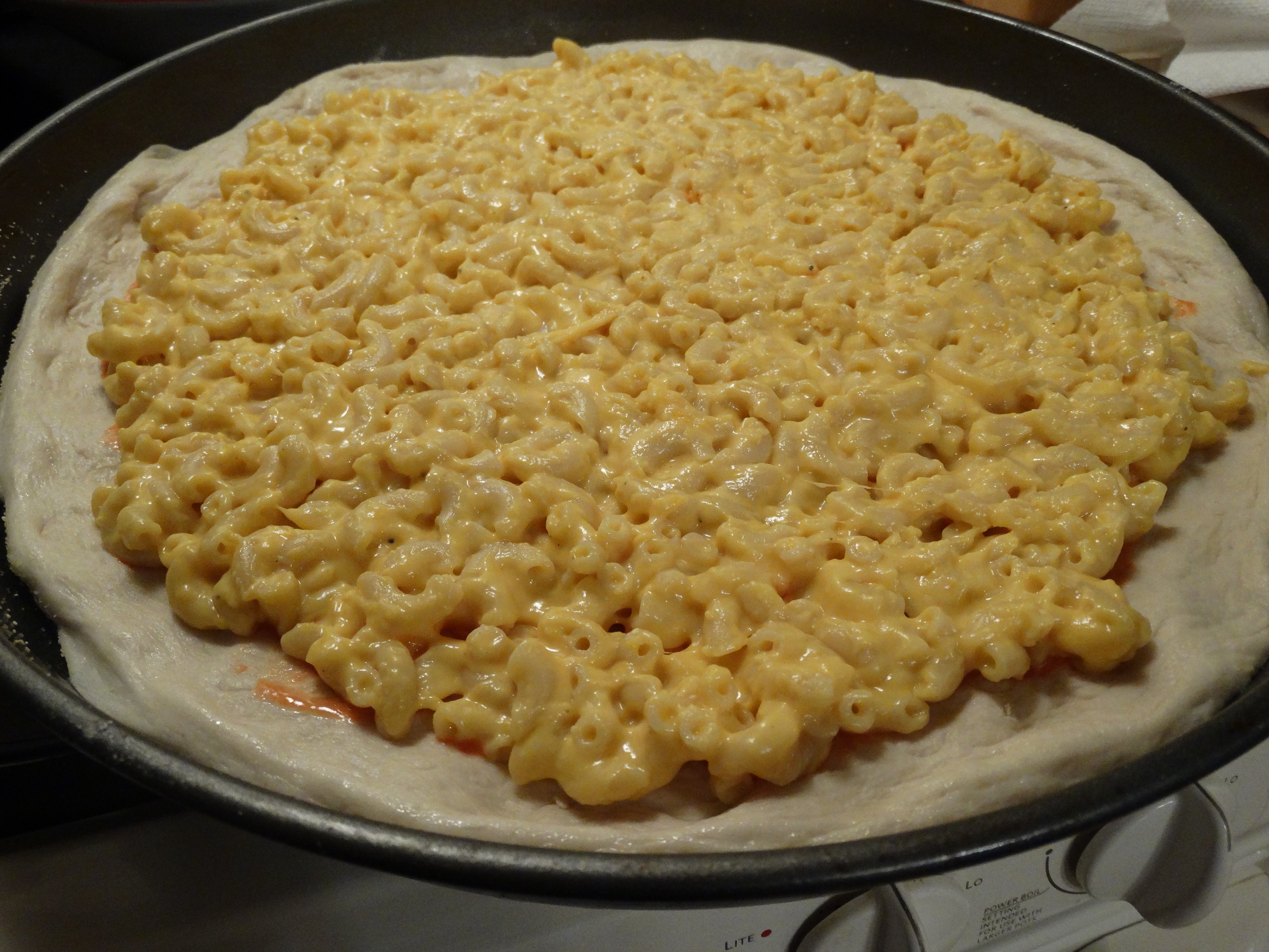We added bacon as well to help differentiate the flavors and further add variety in the pizza. The mac ‘n’ cheese was fantastic on its own, but we wanted it to still be a pizza with multiple flavors in each bite. Bacon is a welcome addition in many mac ‘n’ cheese recipes, and we’ve been looking for a pizza to help redeem it in, since it worked against us in both the Disco Fries Pizza and the Limburger Pizza. On top of this, (no pun intended) we added a simple shredded cheese blend on top for two reasons. Firstly, the mac ‘n’ cheese had a good chance of drying out in the hot oven since it’s already cooked; secondly it’s a pizza, and a molten cheese layer on top is aesthetically important.