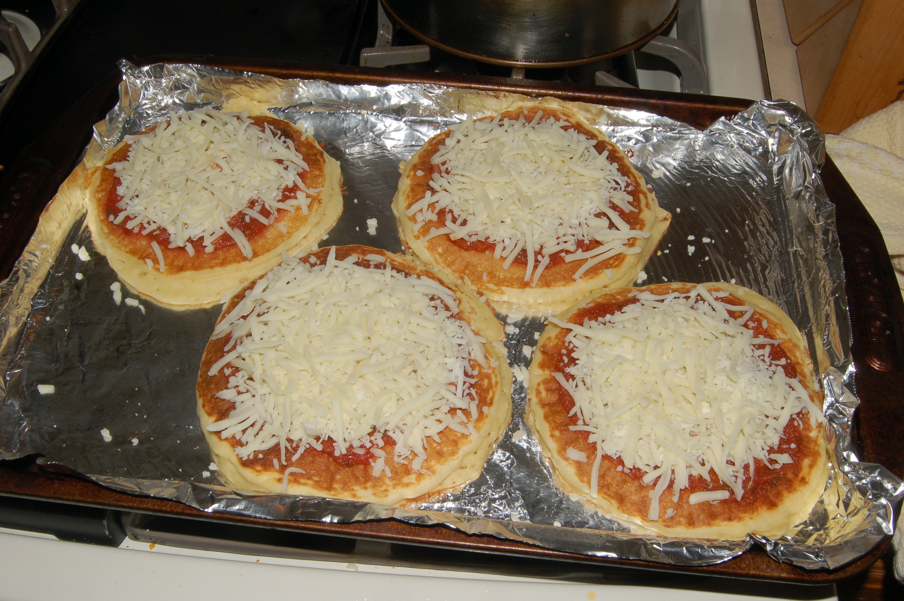 The concept for pancake pizza was simple enough. Essentially it’s a pizza bagel/muffin, but with a pancake as the base instead of a bagel or English muffin. The procedure was uncomplicated, if you know how to make pizza muffins. Earlier in the day Erik made a basic tomato sauce for us to use.