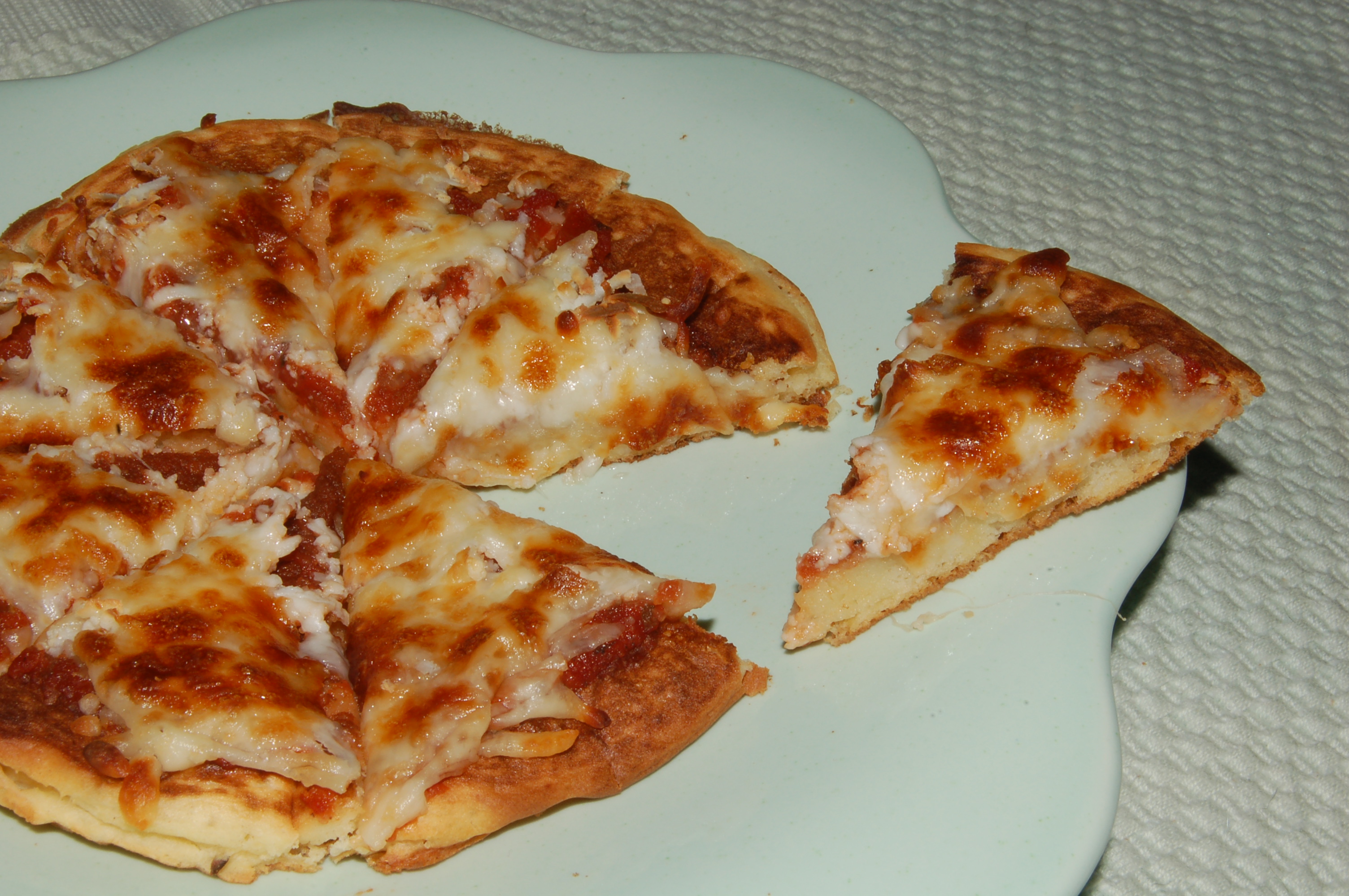 Flavor-wise it tasted pretty good. The pancakes were kind of sweet, since you know, they’re pancakes. But the flavors all worked together well. The trouble with this pizza came down to texture. The pancakes were too fluffy, which is generally a desirable quality when they’re being eaten for breakfast, but just didn’t work as a substitute mini pizza. Bagels and English muffins are all chewy and gluten-y, so they work as substitute pizza crusts. Even the gluten-free pizza dough, while not technically gluten-y had the appropriate amount of chew, so it worked. The pancakes were just too mushy. It was hard to get over the totally wrong texture.