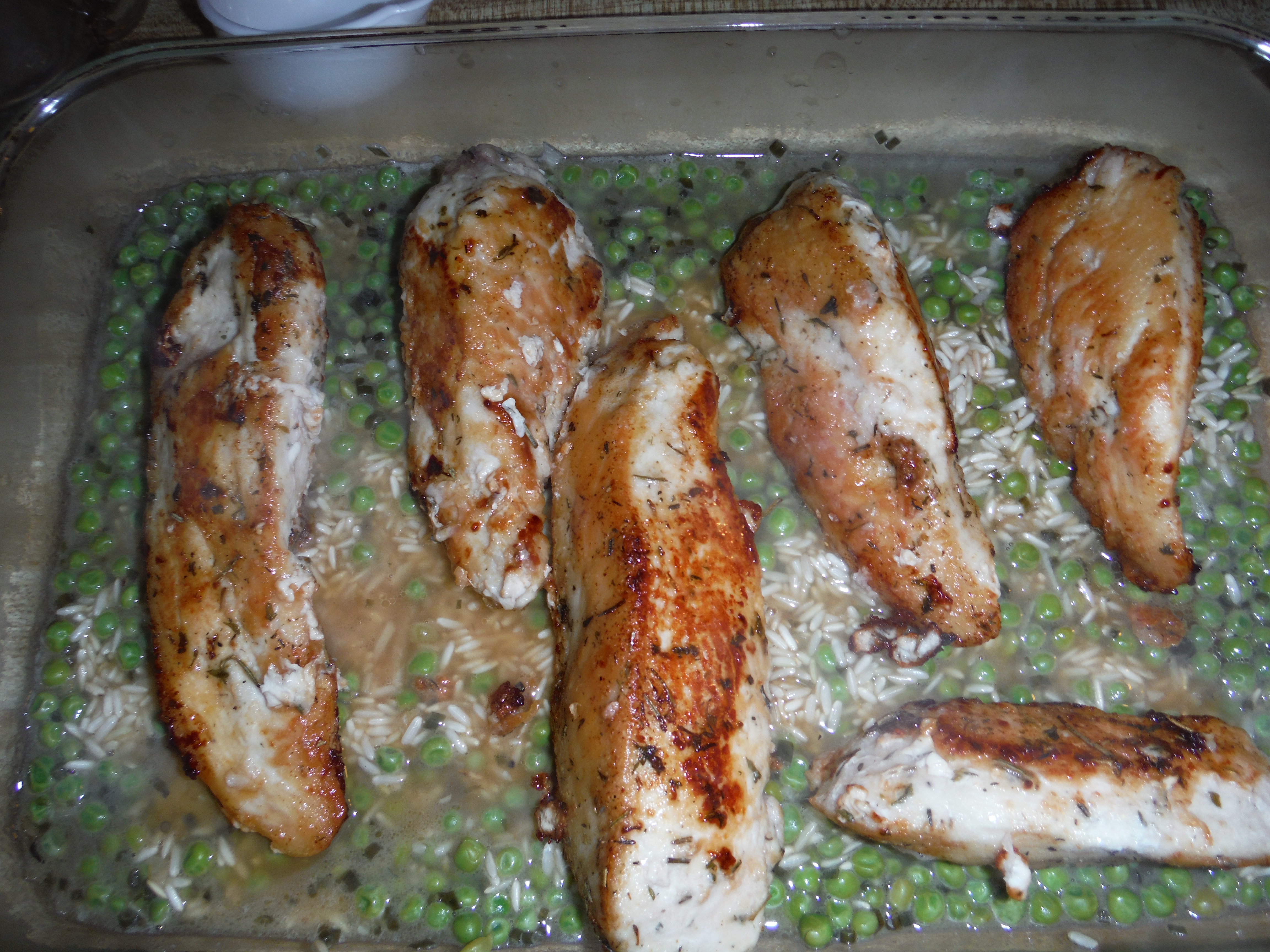 Remove chicken from pan and set aside on a plate. In the same pan add the rest of the ingredients. You don’t need to rinse the pan, just take out any gross blobs of fat that may be in there. Once all the ingredients are in, stir and bring to a boil. Let it boil for a minute or two, then pour the rice mixture into a rectangular baking dish, and place the chicken pieces on top. Pour any drippings from the plate over the chicken and rice.