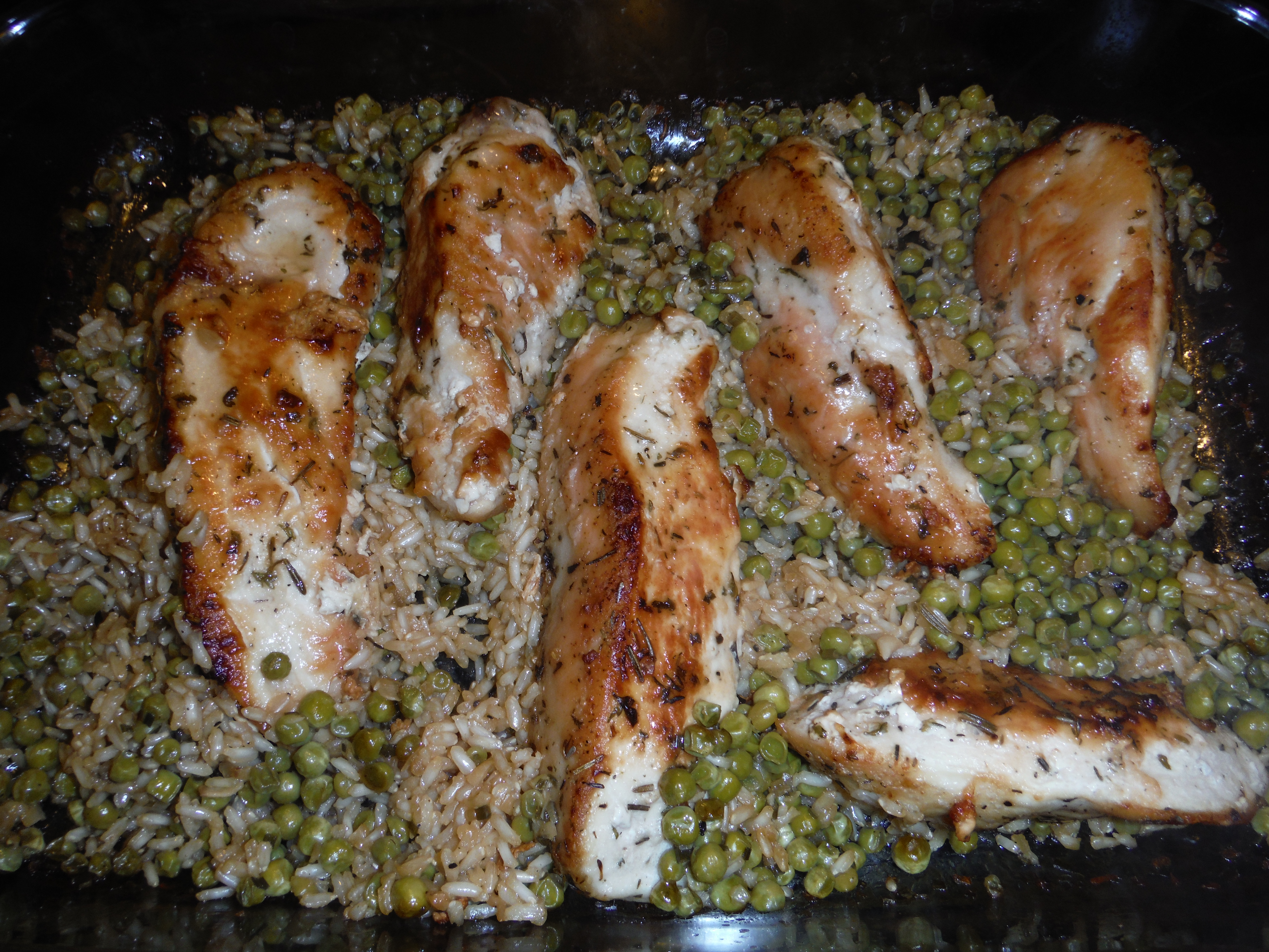 Cook, covered, in a 350 degree oven for 50-60 minutes or until chicken is cooked through and rice is tender. If you use brown rice it will take a bit longer than if you use white rice.