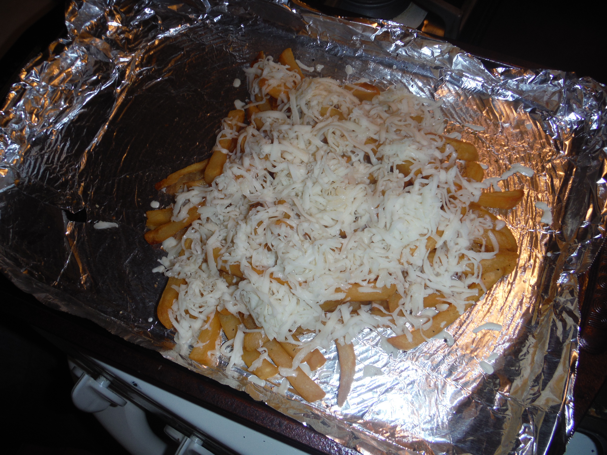Cook the fries in the oven according to the instructions on the package. You’re going to want to line the pan with aluminum foil (and spray the foil with PAM). This will come in handy later. Once the fries are done, switch the oven to broil. Gather all the fries together in the middle of the pan. If you like, add some fresh ground pepper. Top with the mozzarella cheese and broil for a few minutes. I’d give a time estimate, but every oven is different, so you really just need to keep an eye on them.