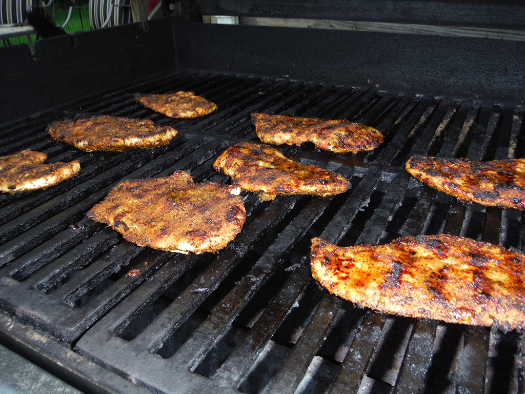 Begin by trimming and cleaning the meat as best as you can. Leaving large amounts of fat on it throws off a ton of grease in grilling, which isn’t ideal for open flames. For boneless skinless chicken breasts specifically, you should pound them with a mallet to tenderize them slightly. Once they’re at around 1/2″ thickness, that’s ideal.