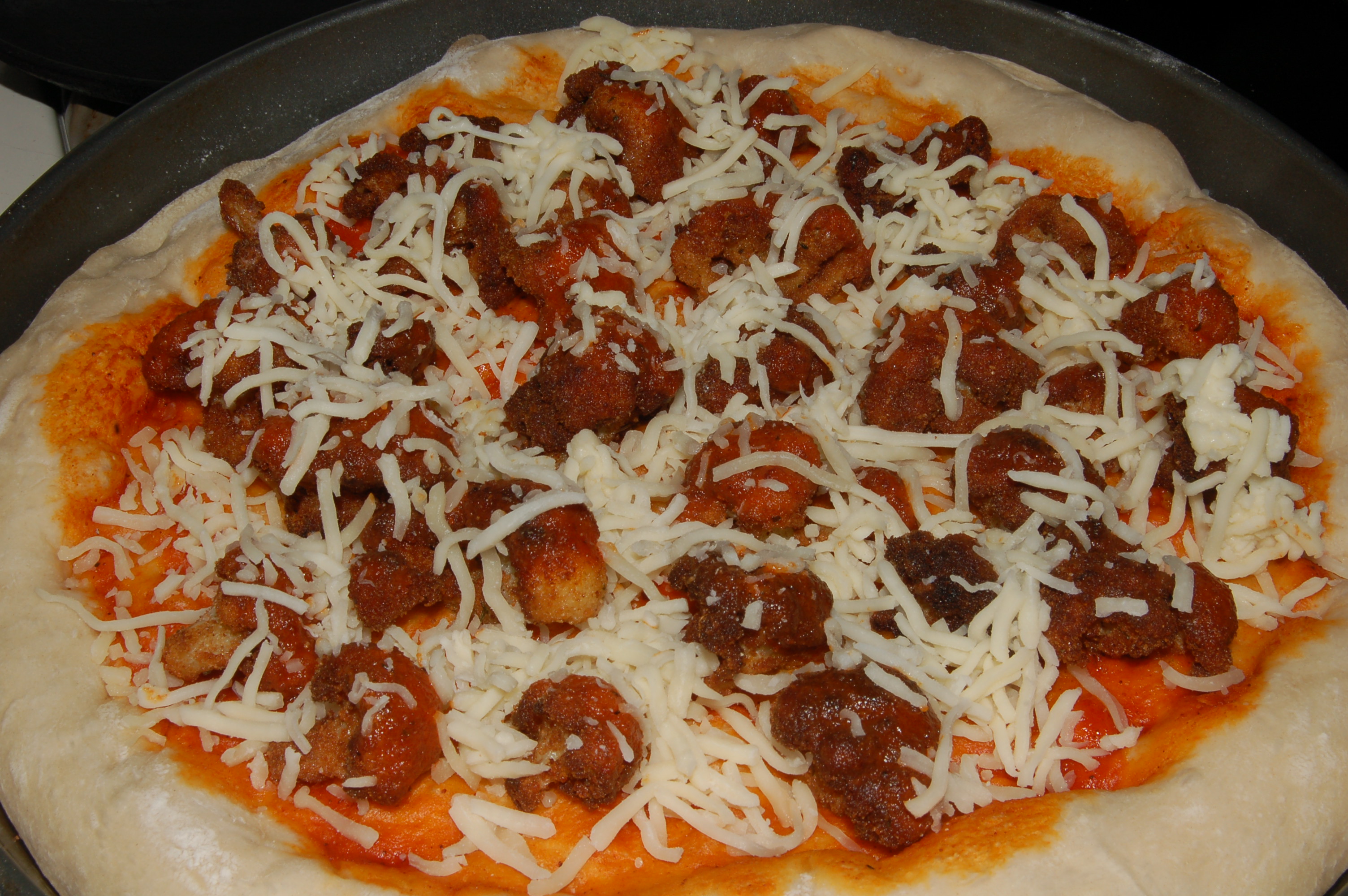 The other major aspect of this pizza was the Buffalo sauce. Personally I love it, while Meg…. not so much (she doesn’t care for spicy foods). I have a good recipe I use when making it from scratch, so I kept it as non-spicy as possible. Buffalo sauce, in its simplest form, is just hot sauce and butter. That’s your everyday layman’s variety, but my own personal recipe is a little bit more involved. After finishing it, it was spread onto the crust as you would with a tomato sauce.