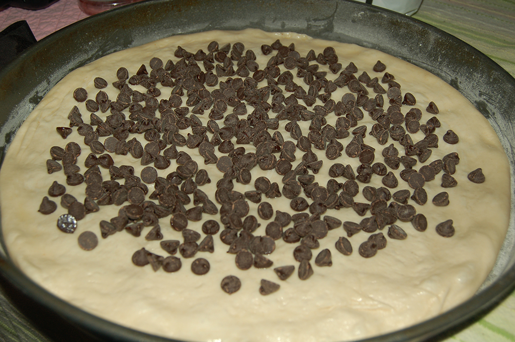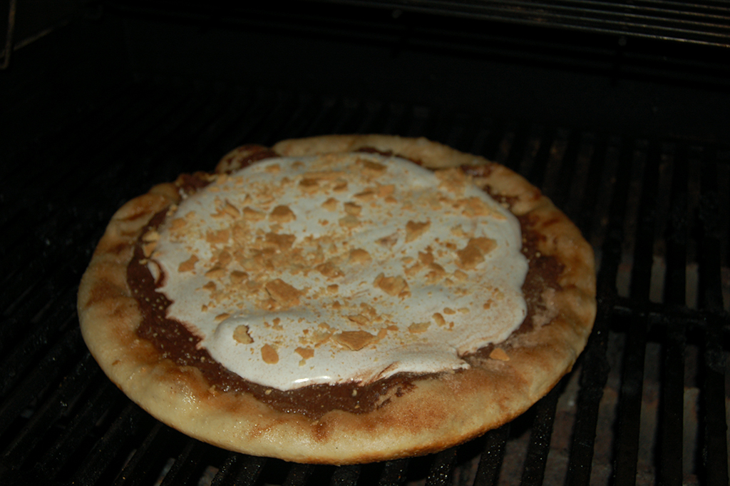 Nonetheless, this pizza solved the eternal problem of trying to get all your s’mores ingredients to be perfectly melty and delicious. We began by sprinkling chocolate chips onto the dough, and parcooked it in the oven, as we usually do with grill pizzas, so that the dough would be firm enough to place on the grill. After a few minutes of baking, the dough was firm and the chocolate was easily spreaded into a layer of liquid chocolatey goodness.