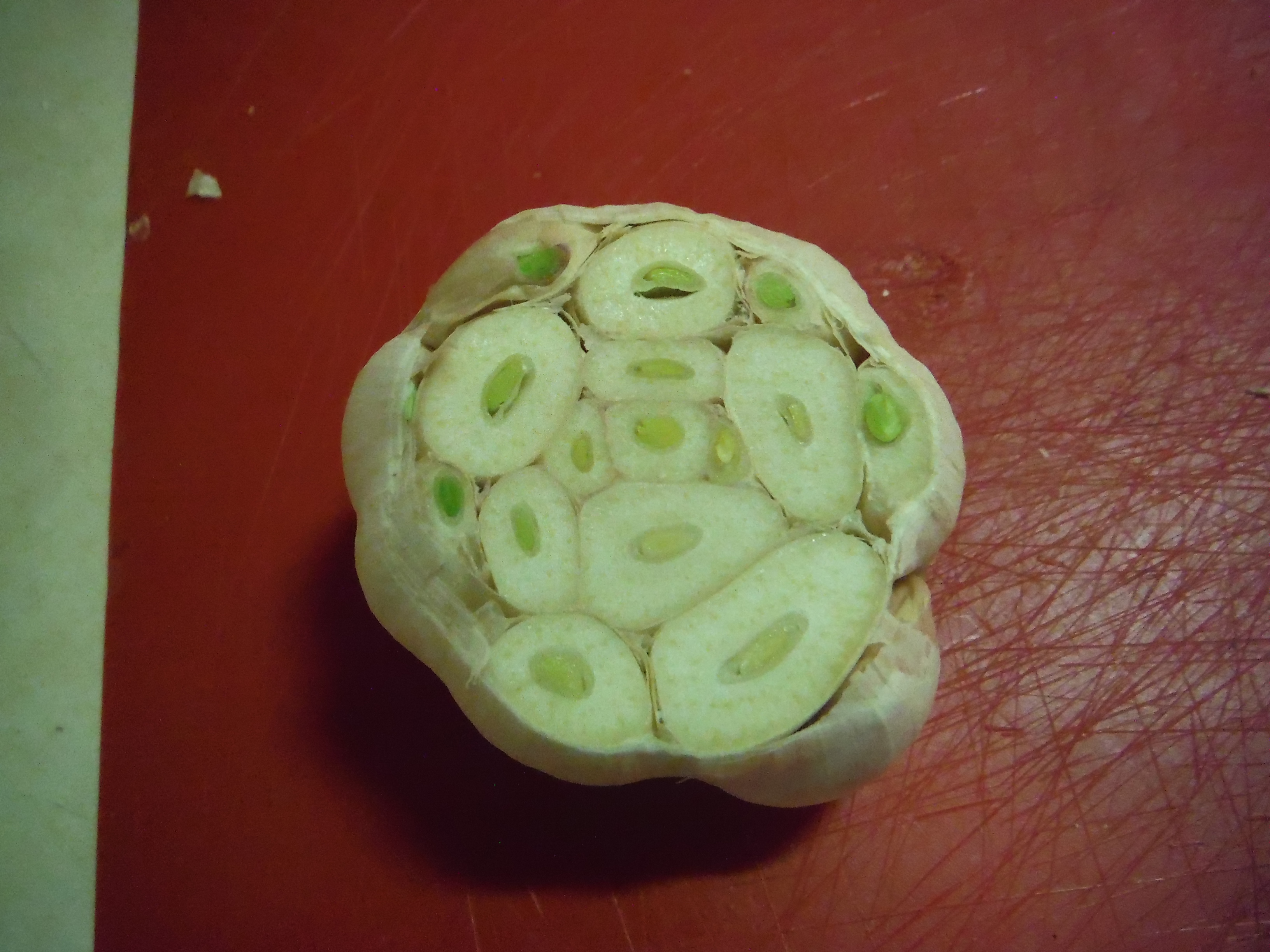 Take a bulb of garlic. Cut off the top of the garlic to expose all cloves. You want to make sure all the cloves get exposed, but you don’t want to cut too much, because then you’ll be wasting half your garlic.