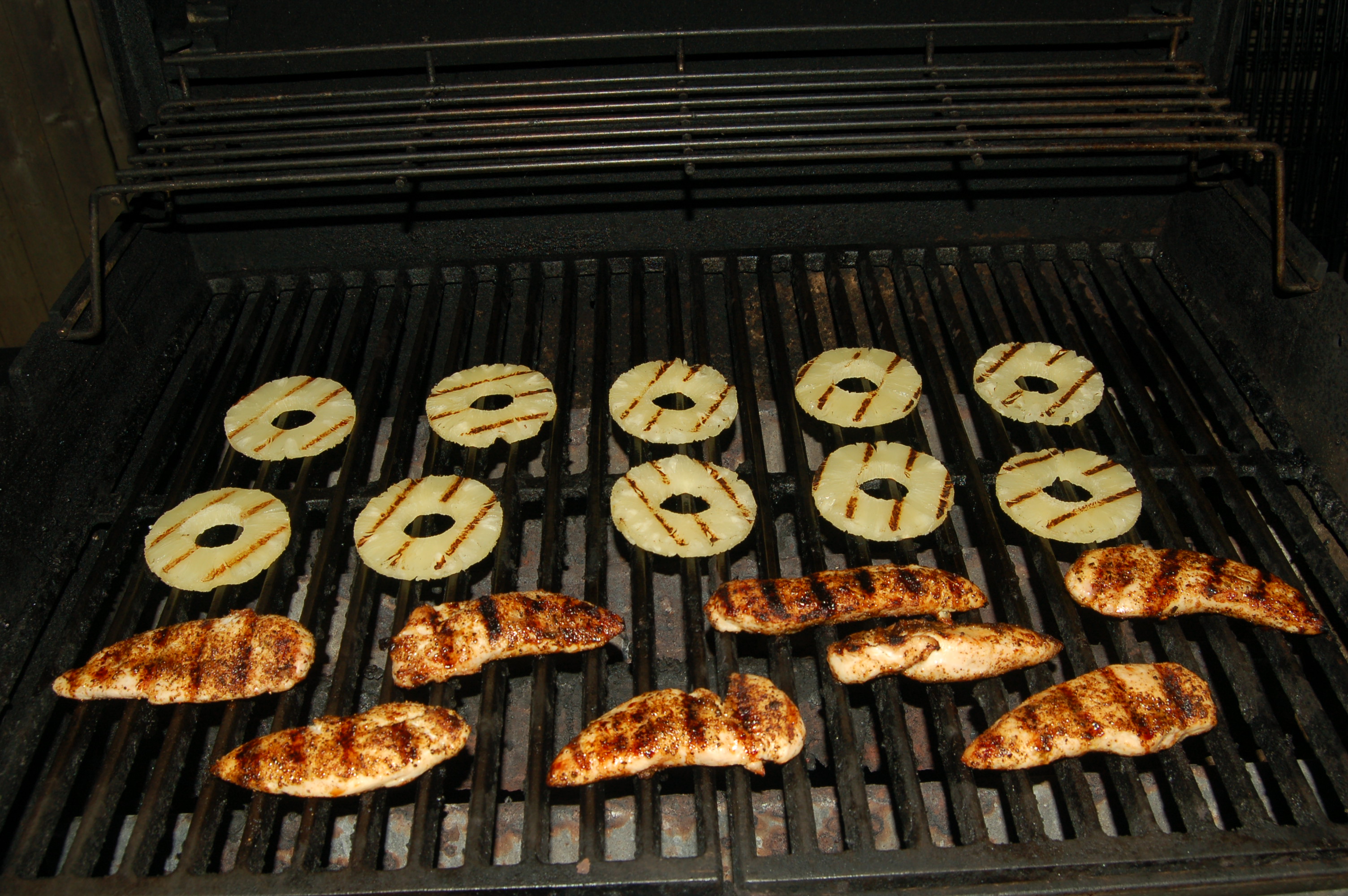 For our pizza we decided to simulate a shish kebab meal by combining pineapple with chicken. Shish kebab seemed appropriate since it’s delicious and totally Summer. Pineapple goes surprisingly well with savory dishes when it’s cooked, since the sugars caramelize and create a sweet, dark flavor that complements virtually everything. As such, we started by grilling chicken and pineapple slices. As you can see, grilled pineapple is whimsical as hell. When it was all done, the chicken was sliced up, but the pineapple remained intact