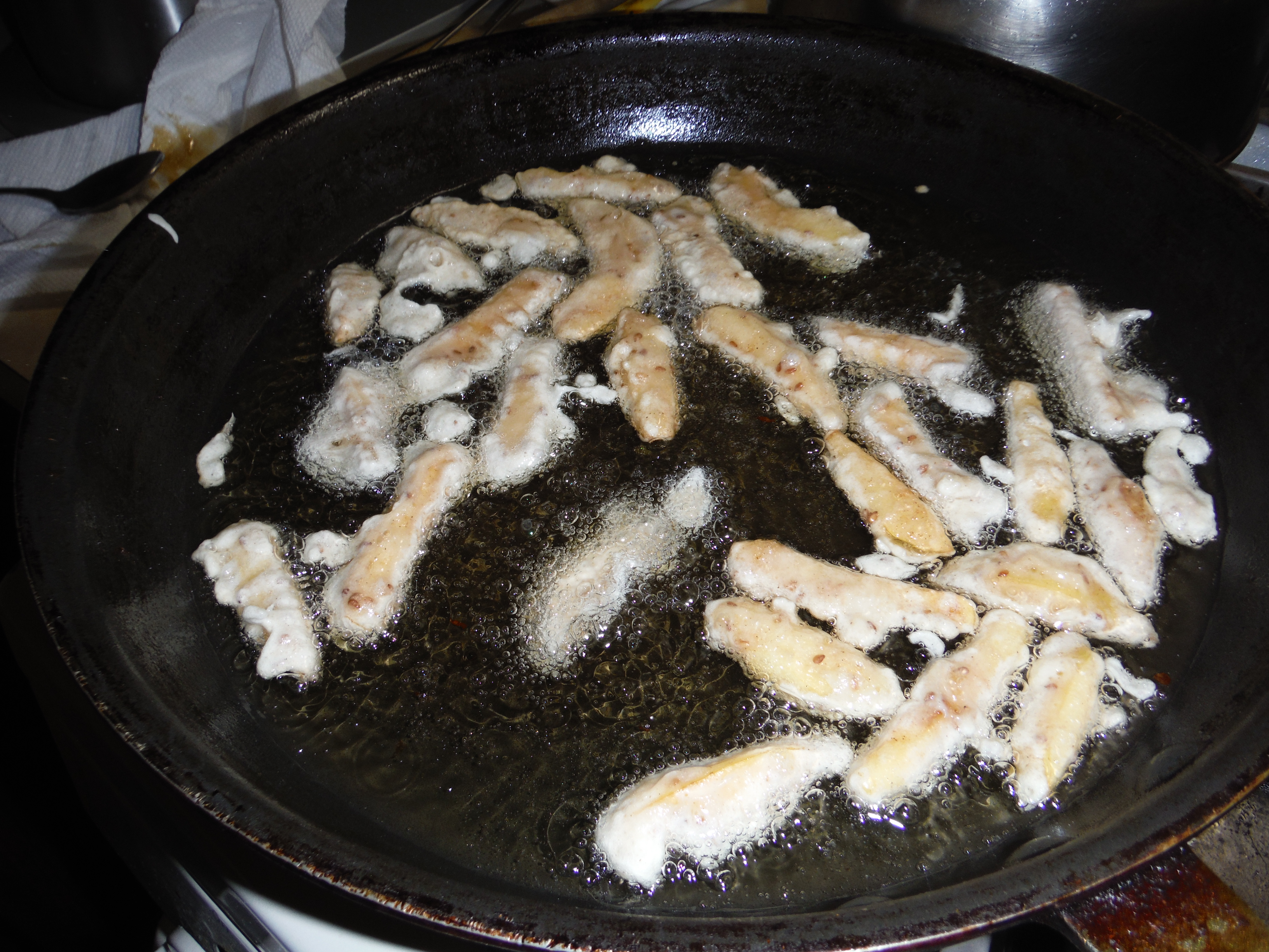 Then cover them in the fry batter. Then into the oil they go. Cook until the batter turns golden brown, and the bubbling around the fries slows down. Turn once during the cooking process. You don’t want to crowd the pan, so you may have to work in batches.