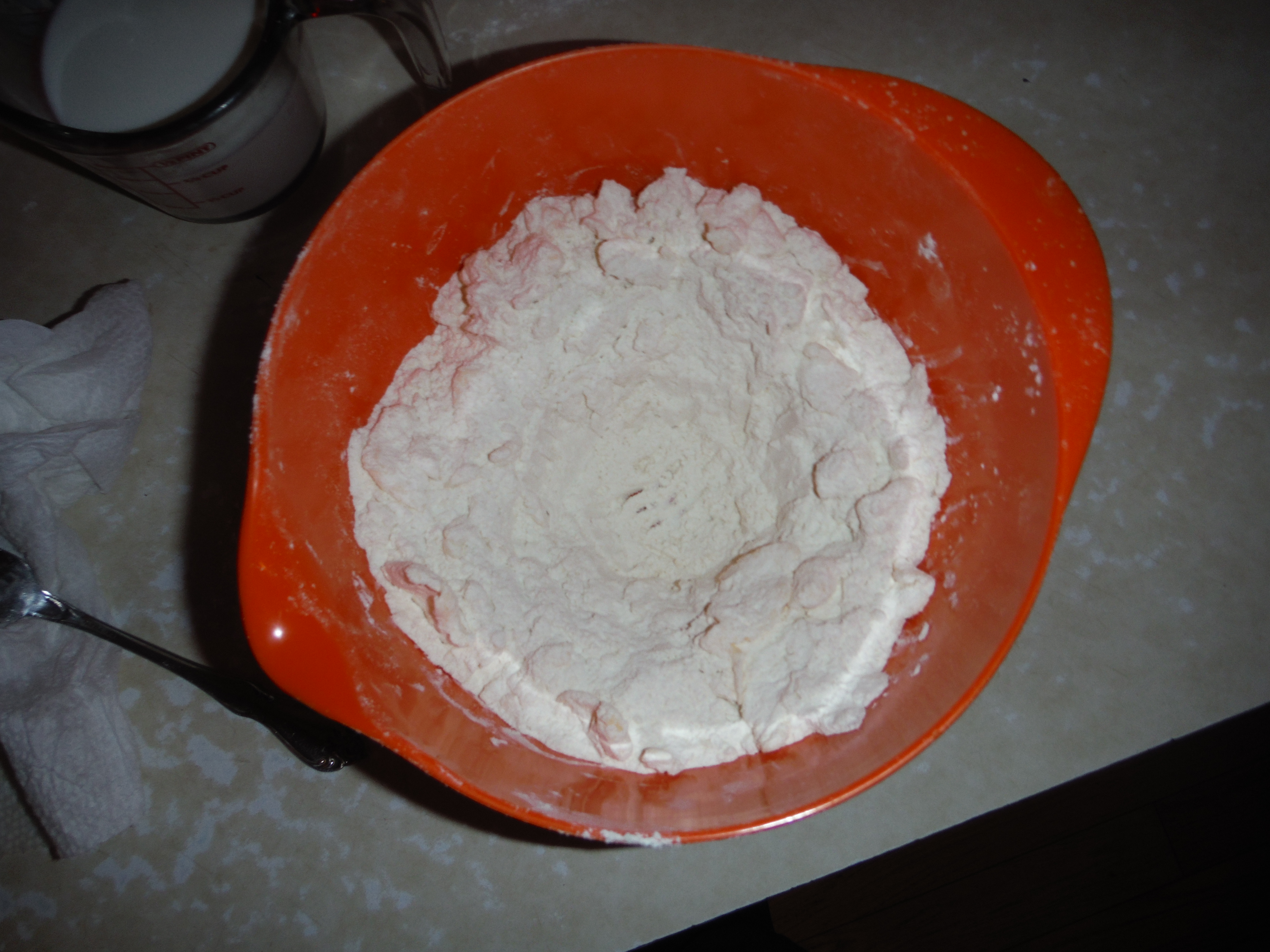 Use a fork to stir the ingredients together until the dry ingredients are just moistened. Lightly flour a clear surface (counter or cutting board) and knead the dough until it holds together.