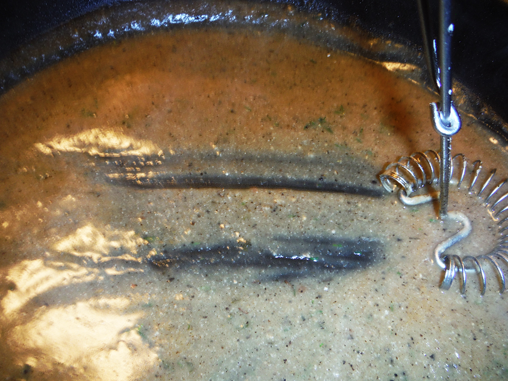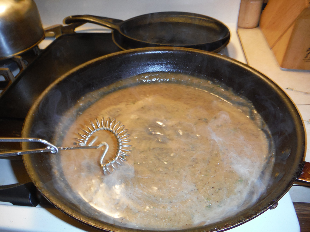 - Continue cooking the gravy on medium heat for several minutes, whisking periodically so that it doesn’t burn. Eventually it will become thick (like a gravy, duh) and is more or less finished. As a rule of thumb, run your whisk or spoon across the pan, and if it leaves behind a streak like so, it’s finished.