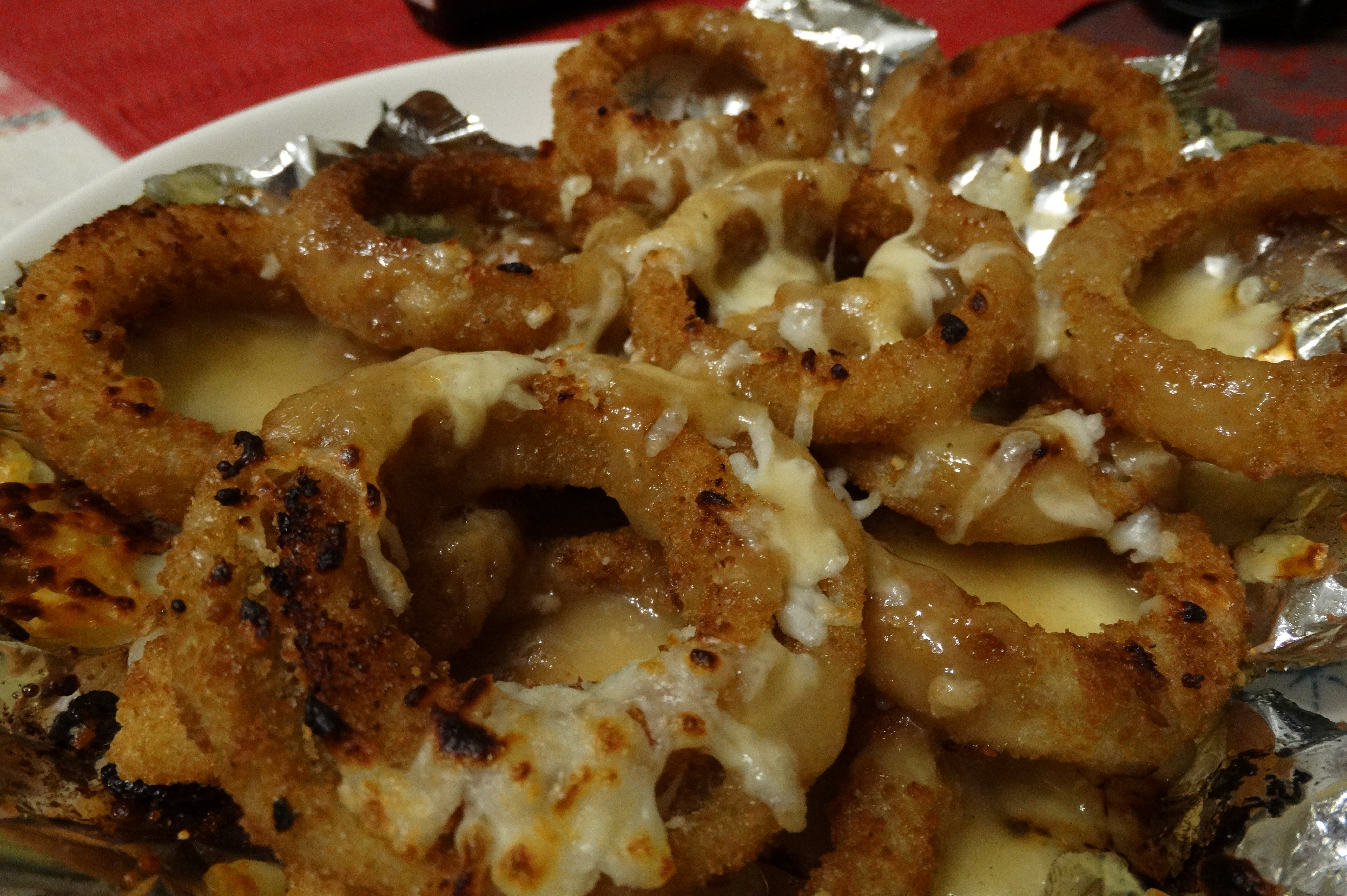 Basic procedure is essentially the same as for disco fries. If you’re using frozen onion rings you’ll need to reheat them in the oven first; if you’re using fresh homemade you can skip ahead to putting on the cheese.