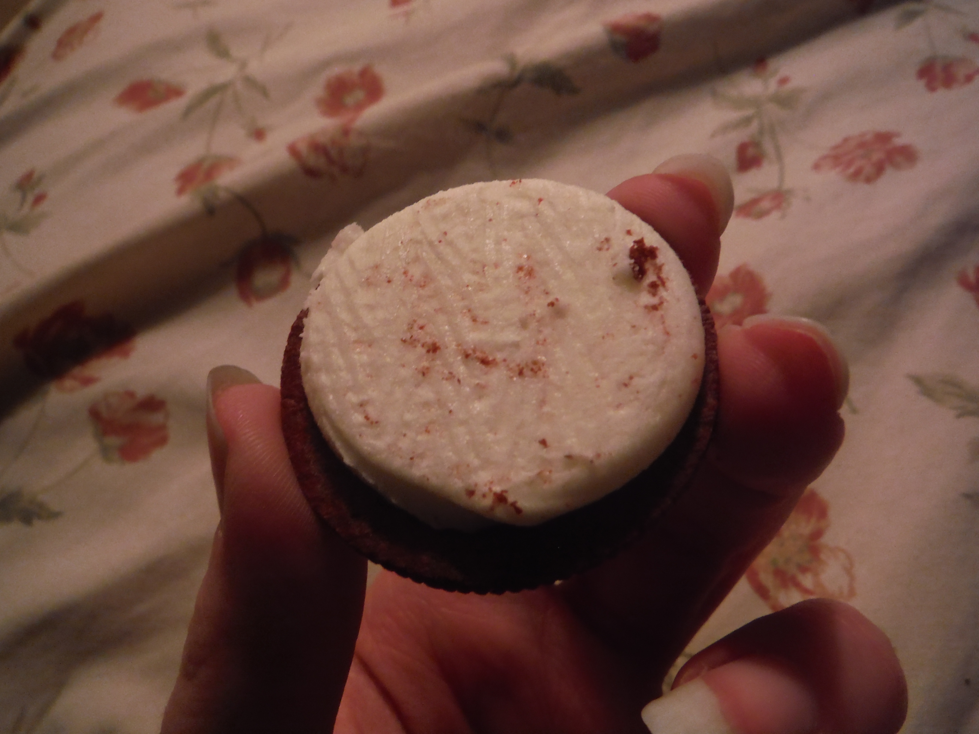 Opening the package we were greeted with the smell of cream cheese frosting. A good sign. The cookies aren’t as red as they appear on the package. They’re really more of a light brown with a hint of red than the rich red most red velvet cakes are. At first I thought perhaps this meant they didn’t use artificial coloring, but alas, this is not the case.