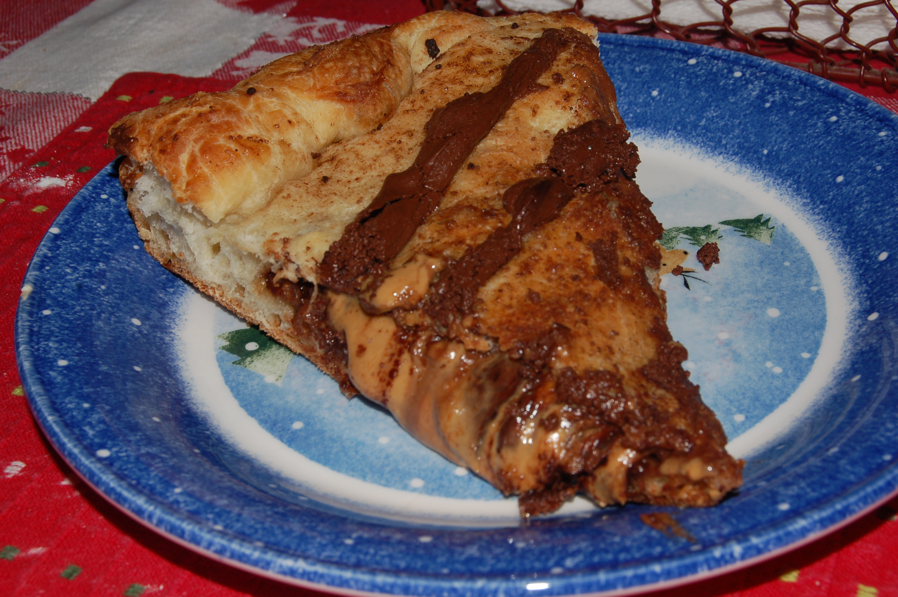 After coming out of the oven, all that was left to do was try it and see how it turned out. So how did it taste? Delicious! The filling tasted almost exactly like a peanut butter cup. The filling was wonderfully gooey. The cocoa sugar on the top crust gave a nice additional chocolate flavor without being overpowering. Something we’ve discovered between this pizza and the s’mores pizza is that chocolate and pizza dough actually go together really well. Overall this pizza was a great success. I suppose the only downside about it is that it is a lot of sweet, so you can’t really eat a lot of it at once. But it’s probably better for our waistlines that way anyway.