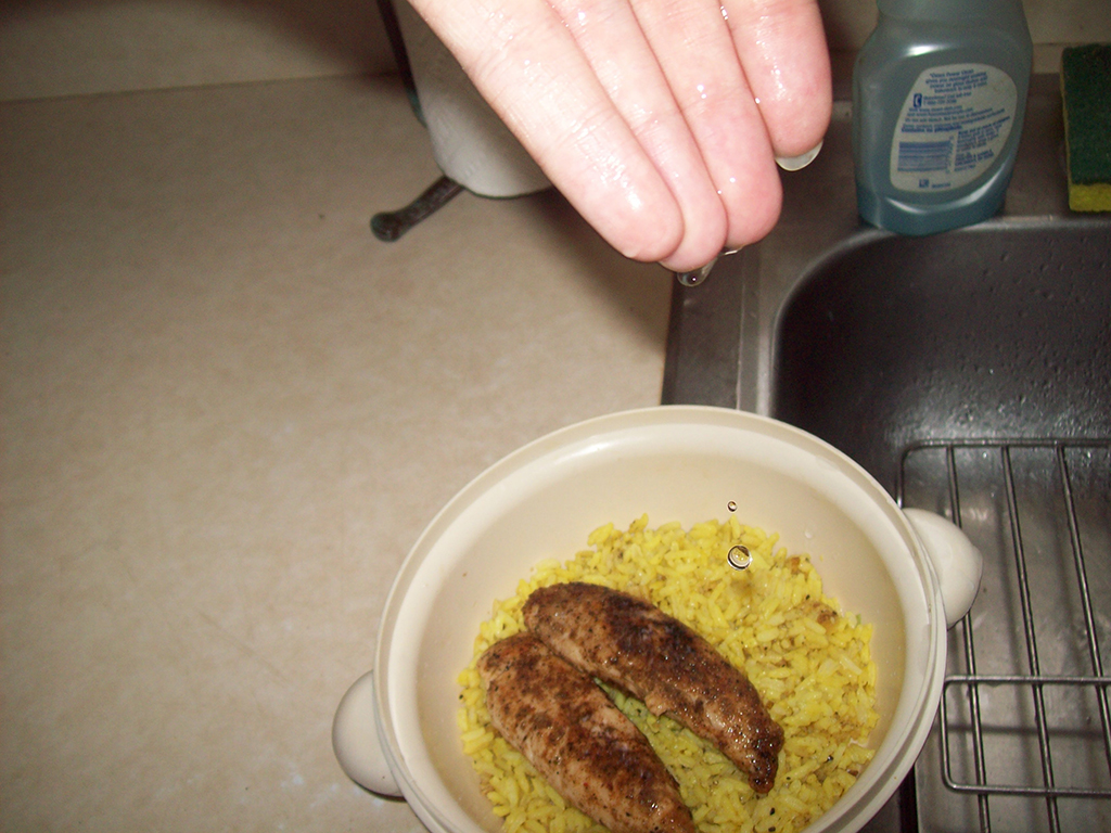 My special, patented technique for keeping your foods moist is by quickly running water off my hand into the rice. Basically, place your container next to the sink and turn your water on. Make a small cup with your fingers and catch a little bit of water into it. Now take this water and sprinkle it over the rice. It sounds convoluted, but trust me, it’s the easiest way to do this. The idea is to get a little bit of water evenly distributed around the rice but without saturating it. If you just plop a teaspoon of water in, it’s all gonna sit in one spot and you’ll have soggy rice in that one spot. Trying to trickle water in slowly via your faucet sounds good, but in reality it’ll probably also create soggy rice since you can’t see how much water is pooling under the rice. Just go with the fingers technique, it never fails.