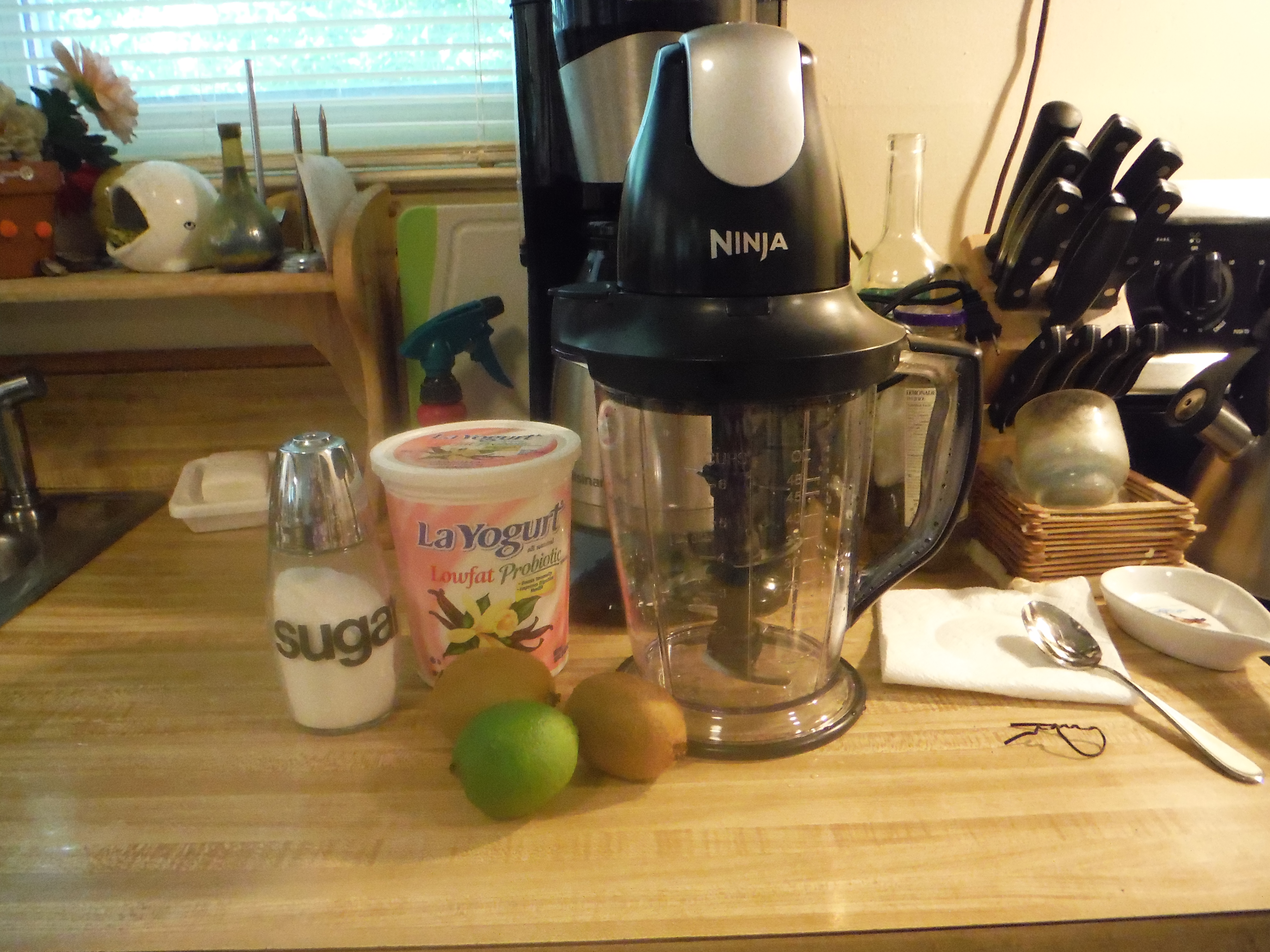 Lime is probably one of my favorite citrus flavors. It’s so refreshing and also smells wonderful. I’m very upset that green apple has become the go-to flavor for green candies and the like, pushing lime out of the way. I also enjoy lime in smoothies. They definitely need to be combined with another fruit though, because otherwise you’ll just end up with a limeade drink. This time I decided to try mixing lime with another green fruit – kiwi. While a good start, I will definitely be experimenting with other lime smoothies in the future as well.