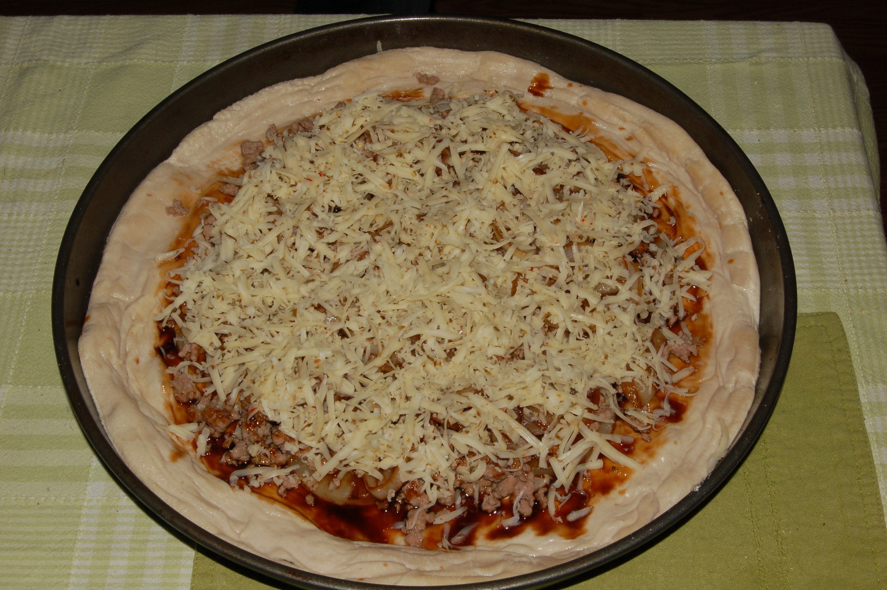 Next we added pineapple rings, since the pineapples go on the bottom bun for the burger. It is very important to thoroughly drain/pat dry your pineapples before putting them on your pizza (we may or may not have found that out the hard way).