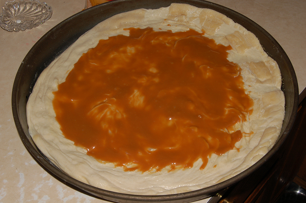 Obviously the first step was caramel sauce. We have a recipe we use for caramel sauce in most of our recipes calling for it, though on something being baked, pretty much any caramel could do. Warming up said caramel is a must, since it’s being used for the base sauce on the crust.