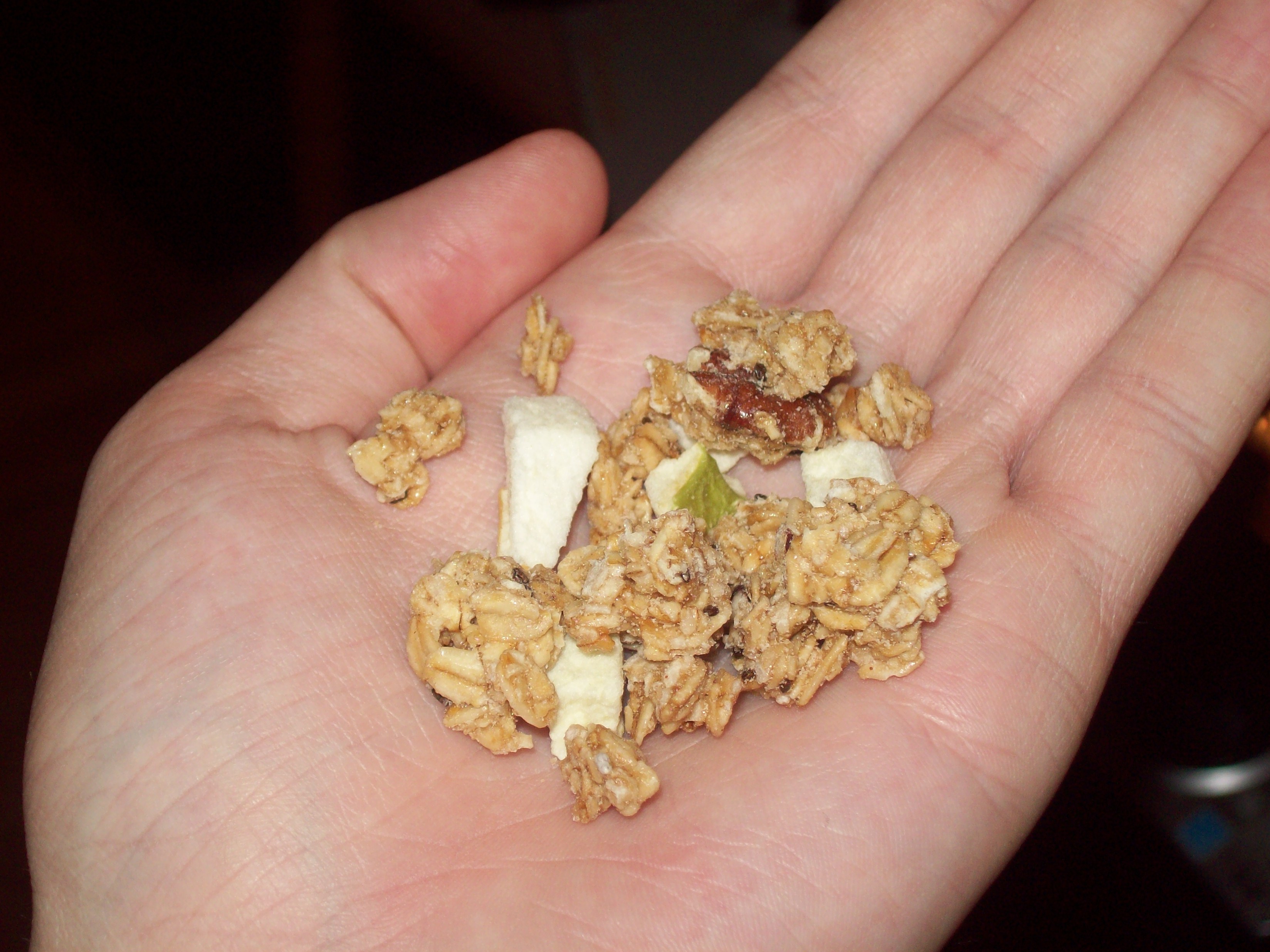 There’s a bunch of ways to enjoy granola, including making bars out of it, cookies, eating it as cereal, or just eating it straight. Personally I do the latter; I’m a snacker. I just eat handfuls of it, or bring it with me as a quick way to eat breakfast or some sort of mini-meal. The package is resealable, so it should never go stale either. One bonus it features too, is that the granola pieces are actually pretty chunky. I mean, you don’t necessarily want every single cluster to be a giant boulder of granola, but at the same time you do want some clusters since that’s what gives you the awesome crunch. For comparison, here’s one of the bigger pieces I found in Apple Chia Crumble, compared the biggest chunk I could find at the top of the bag from a different brand: