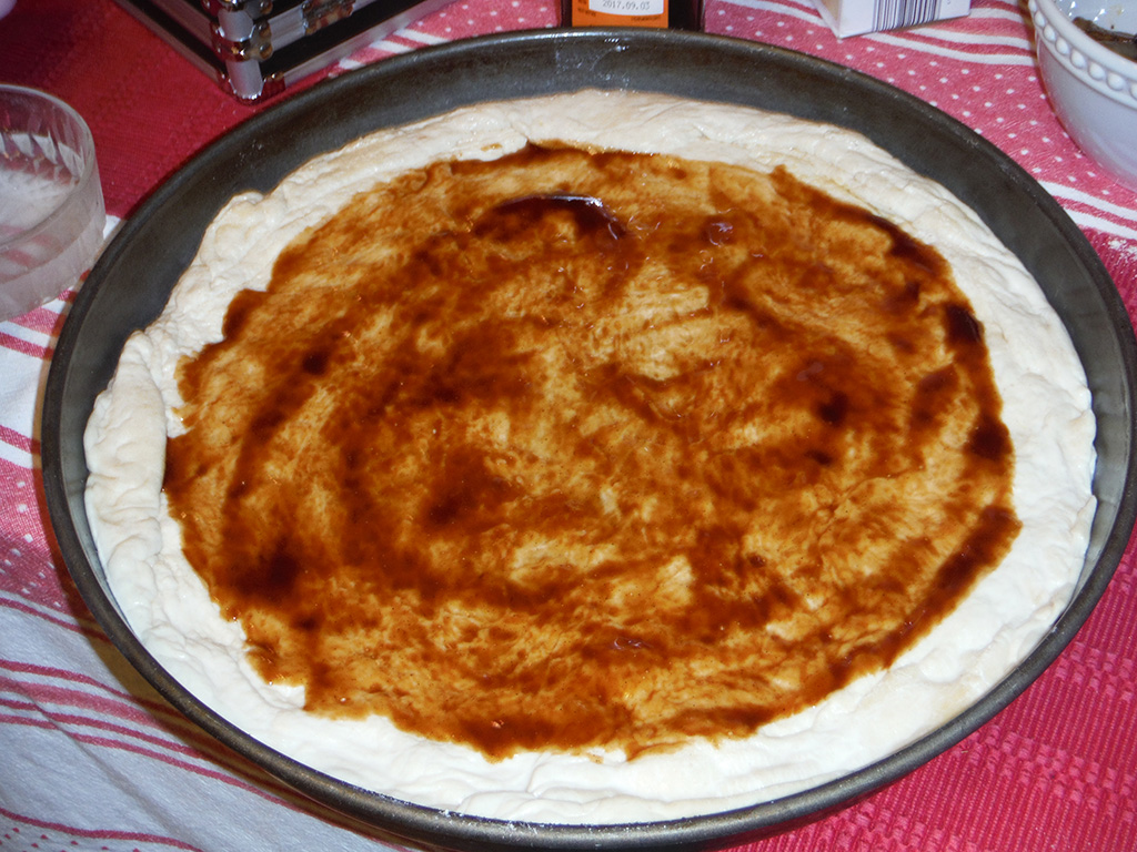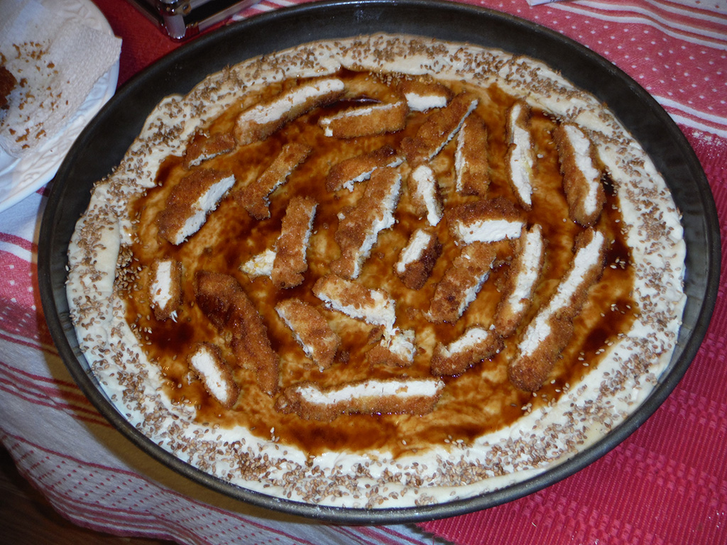 Interestingly, we originally thought about making this pizza a curry pizza, but figured that might end up too heavy. We opted instead for just the katsu itself, realizing it as a sort of Japanese version of very first Pizza Lab, our Chicken Fingers Pizza. As mentioned, the breaded cutlets are usually eaten with katsu sauce. We spread a layer of this sweet, fruity, yet savory dressing onto the dough. As an added touch we sprinkled toasted sesame seeds and panko breadcrumbs onto the outer crust to give it some extra crunch and flavor.