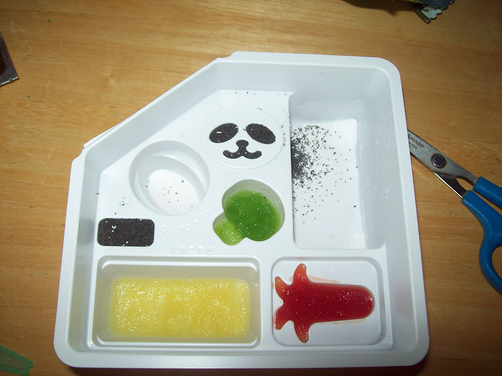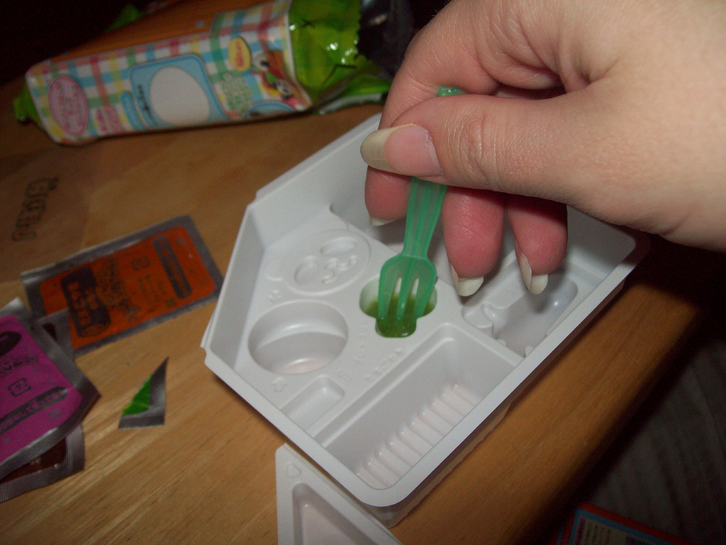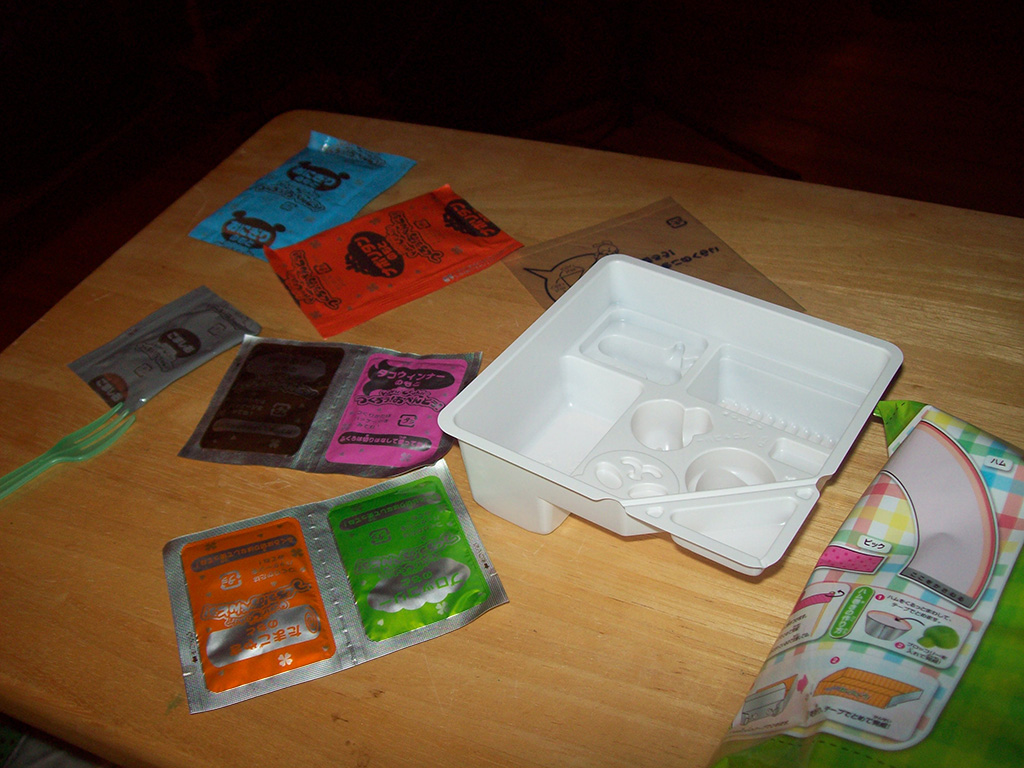 The idea here is that the packets contain special gummy mixture that when mixed with water will turn to gel rather quickly. You mix them up using the tiny fork they give you, in the molds, and pop ’em out to make candy bento. It sounds pretty simple, and for the most part it is, though it certainly helps that I do know a bit of Japanese, at least enough to make my way through the directions. However, if you don’t speak any yourself, allow me to give you a very condensed overview of the process.