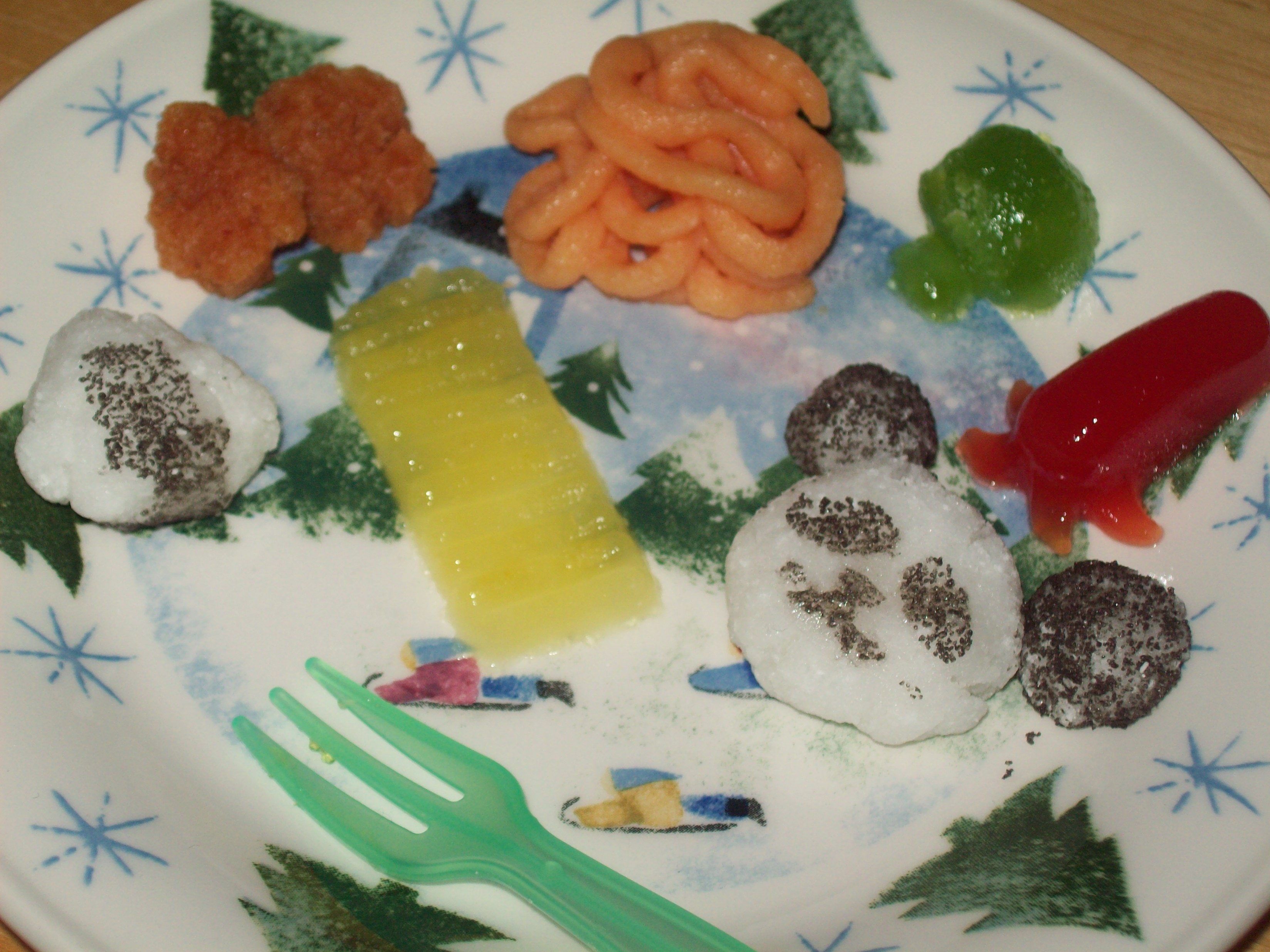 The only two that are somewhat tricky are the spaghetti and the rice balls. The spaghetti gets mixed into a little bag, which you cut the corner off of. You then squeeze it out of there onto the plate, in a long strand, so it looks like noodles.