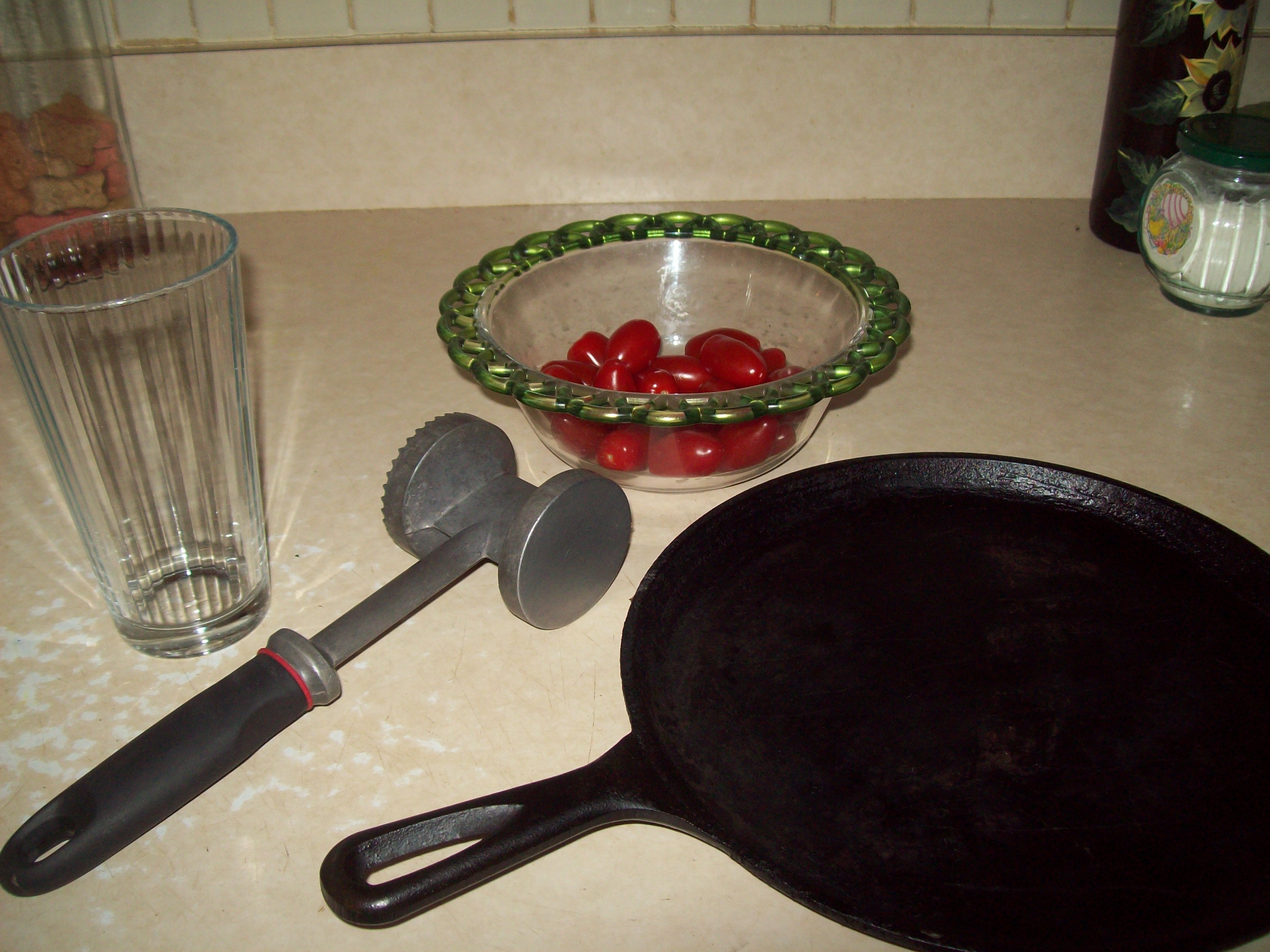 - Select something solid and sturdy, with a totally flat bottom. This could be a glass, a bowl, a skillet, a meat mallet, a jar, or even a bottle.