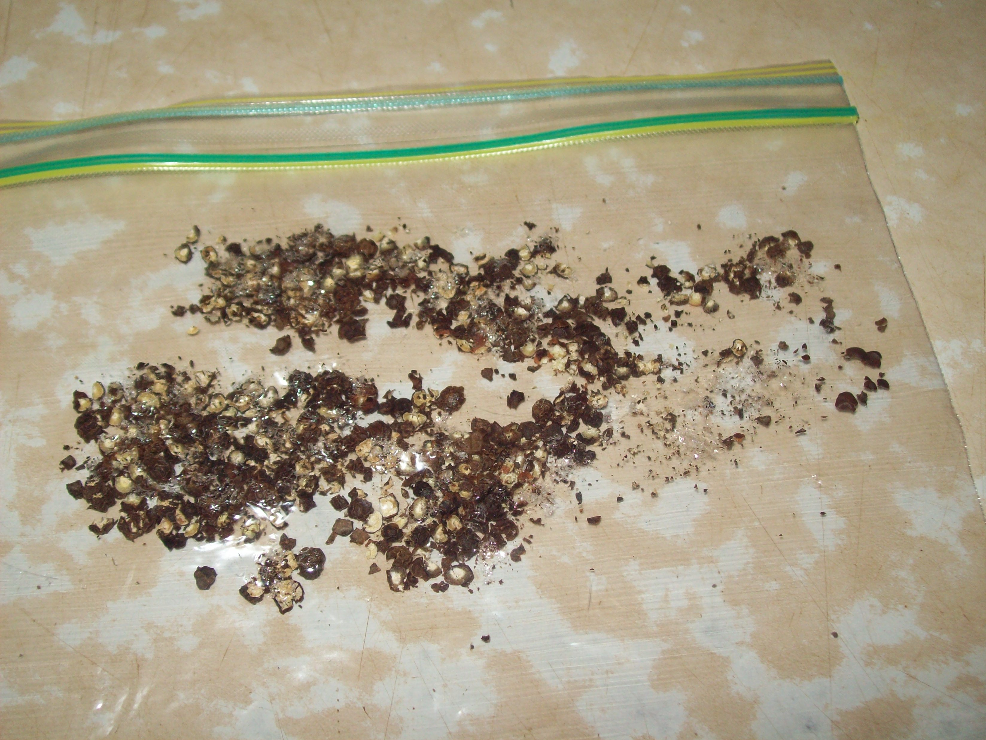 - Work the peppers only a few at a time, since it’s difficult to do more than a few at once. As the peppercorns break apart, move onto different ones in the bag, taking care to not rip it open. Once they’re all broken apart, you’re finished!
