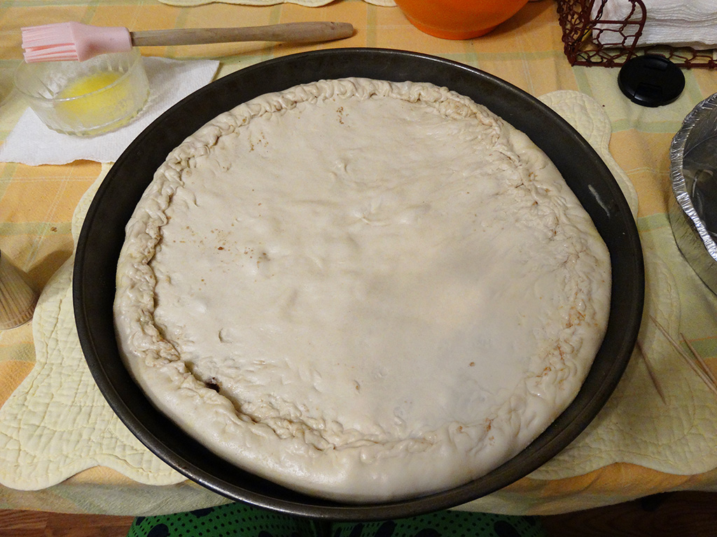 Then it was time to use half of the other dough to form the top layer. Once it was stretched out the two crusts were crimped together to seal the pizza shut.