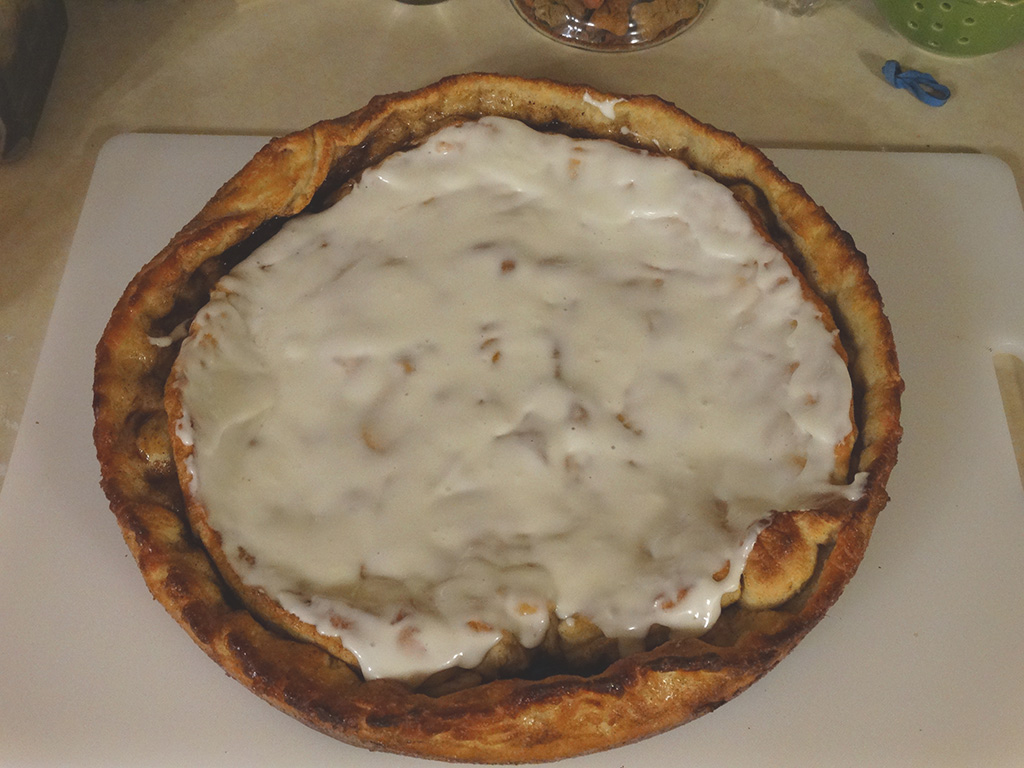 Once the pizza was out of the oven and the pan we spread on a generous layer of the frosting. And to our surprise, once the frosting was on, the exploded crust actually kind of worked in our favor to make it look more like a cinnamon bun!