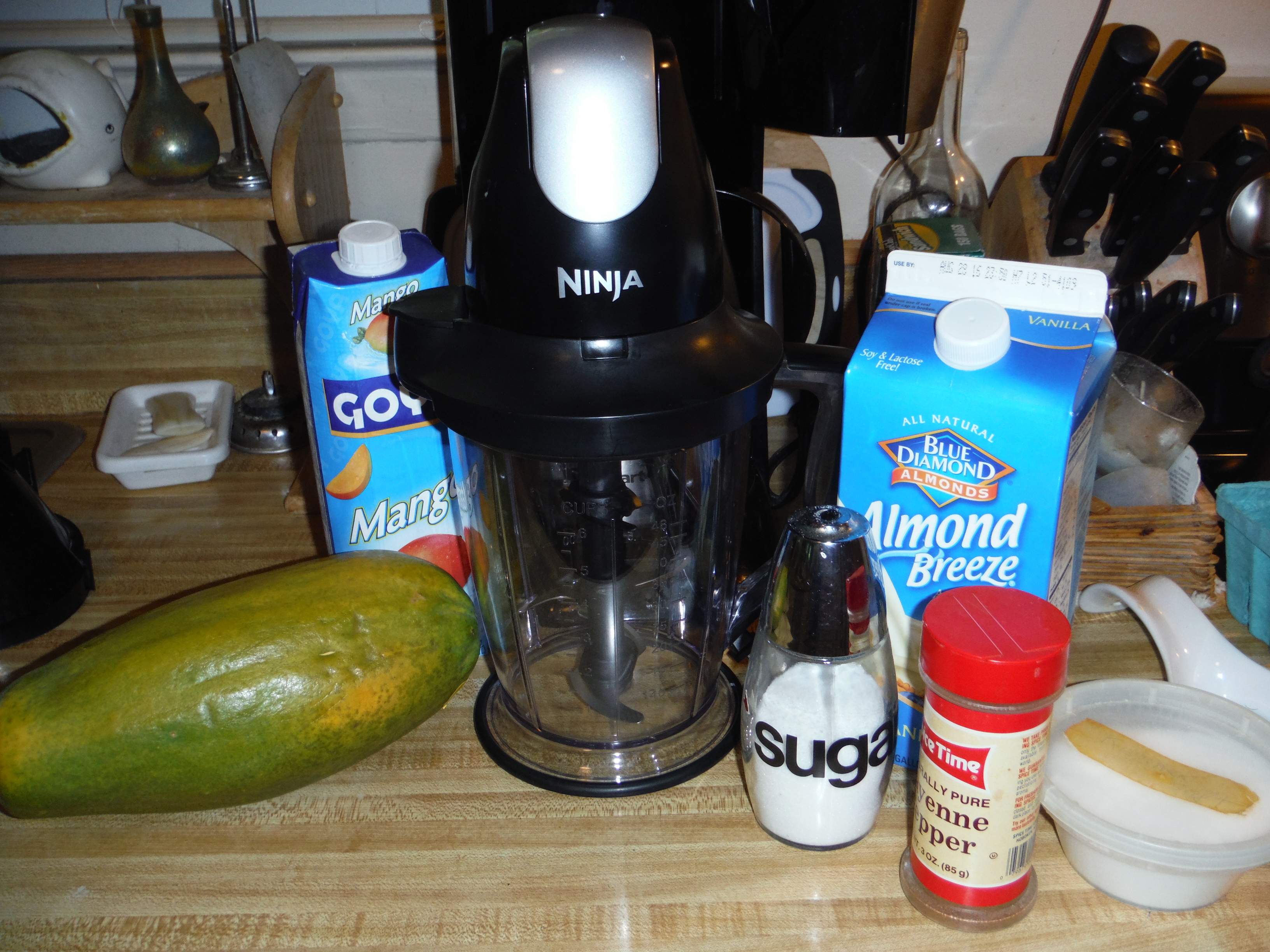 Last year I experimented with vegetables in my smoothies more (and I still probably will a bit this year as well). This year I’ve decided to experiment with new, slightly more exotic fruits. First up is papaya. I’d never actually had papaya before this, so I wasn’t even really sure what it tasted like, but I figured since it’s a tropical fruit it’d be yummy. Papayas aren’t really that hard to find, you can usually find them in the produce department of most grocery stores (at least in my neck of the woods) there just isn’t always a huge selection of them. Unfortunately, not knowing much about papayas I don’t think I let mine ripen enough before use. If you’re going to try out this recipe, make sure the skin on your papaya is more yellow than green. While yummy, I will note that this smoothie may not be for everyone, because the papaya takes on a bit of a gelatinous texture when blended that some people may find unpleasant. I didn’t mind it though. You may also be able to negate this a bit by adding more liquid.