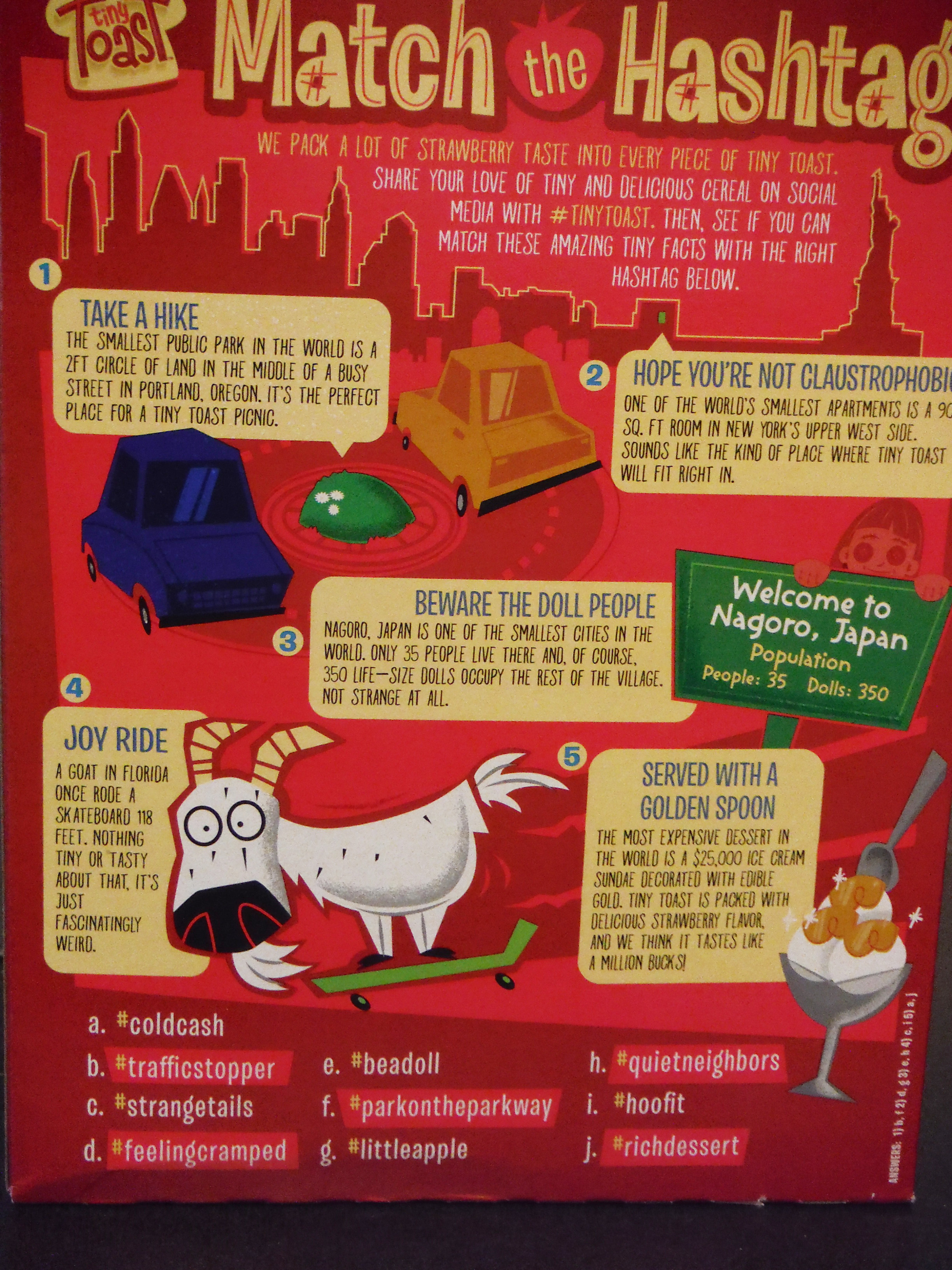 Can we just stop for a minute and marvel at this bizarre trivia game on the back of the box? Not only is the premise to just match up hashtags to fun facts (a really strange occurrence that I never saw coming), but I love how quickly they gave up on the “tiny stuff” theme in the fun facts. Number one is about a small-sized park, number two is about a tiny apartment, and the third is about a small Japanese town filled with dolls. Alright, those check out. Then number four just makes an absolute beeline and informs you about a goat riding a skateboard in Florida, and the final one is about an ice cream sundae that costs $25,000. I think I got whiplash from the segue in that last one honestly… “Here’s a factoid about ice cream with gold on top! …This cereal has nothing to do with that, but it tastes great!” The most beautiful part about these is that #4 explicitly admits how random the goat fact is, without trying to even tangentially tying them together. It just all feels like an intern at General Mills spend 8 minutes designing the box after quickly Googling “Fun Facts About Small Things” and then giving up halfway through. But I digress…