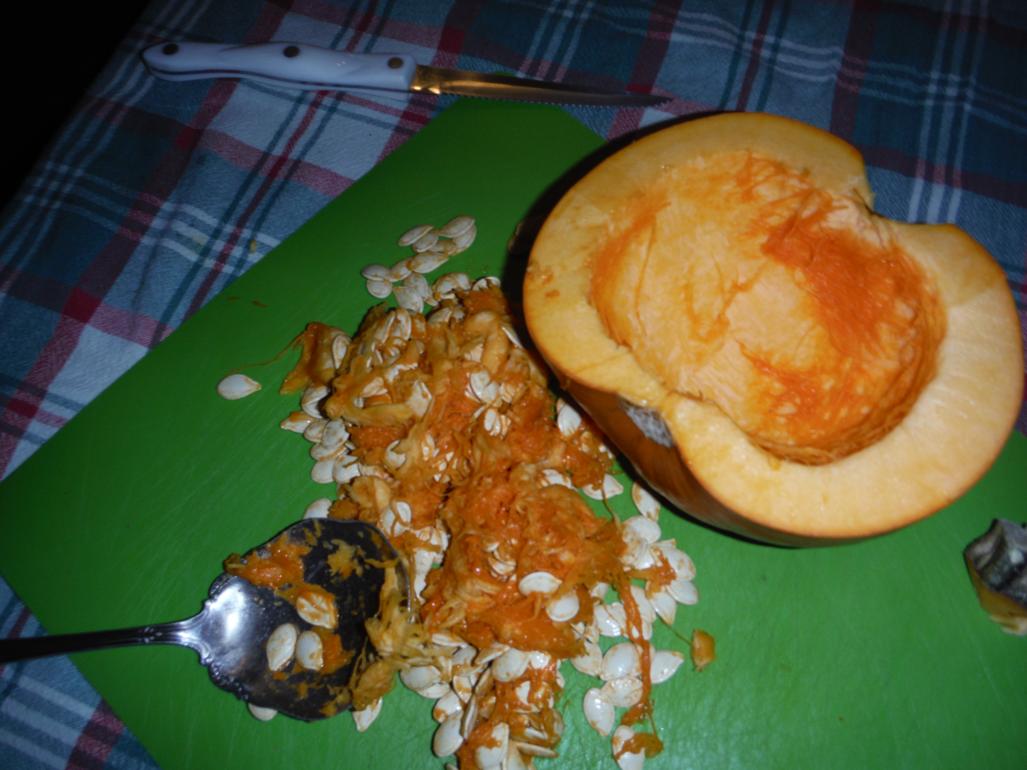 Both roasting processes begin with cutting your pumpkin in half and scooping out the guts. And also preheating your oven to 375 degrees (Fahrenheit).